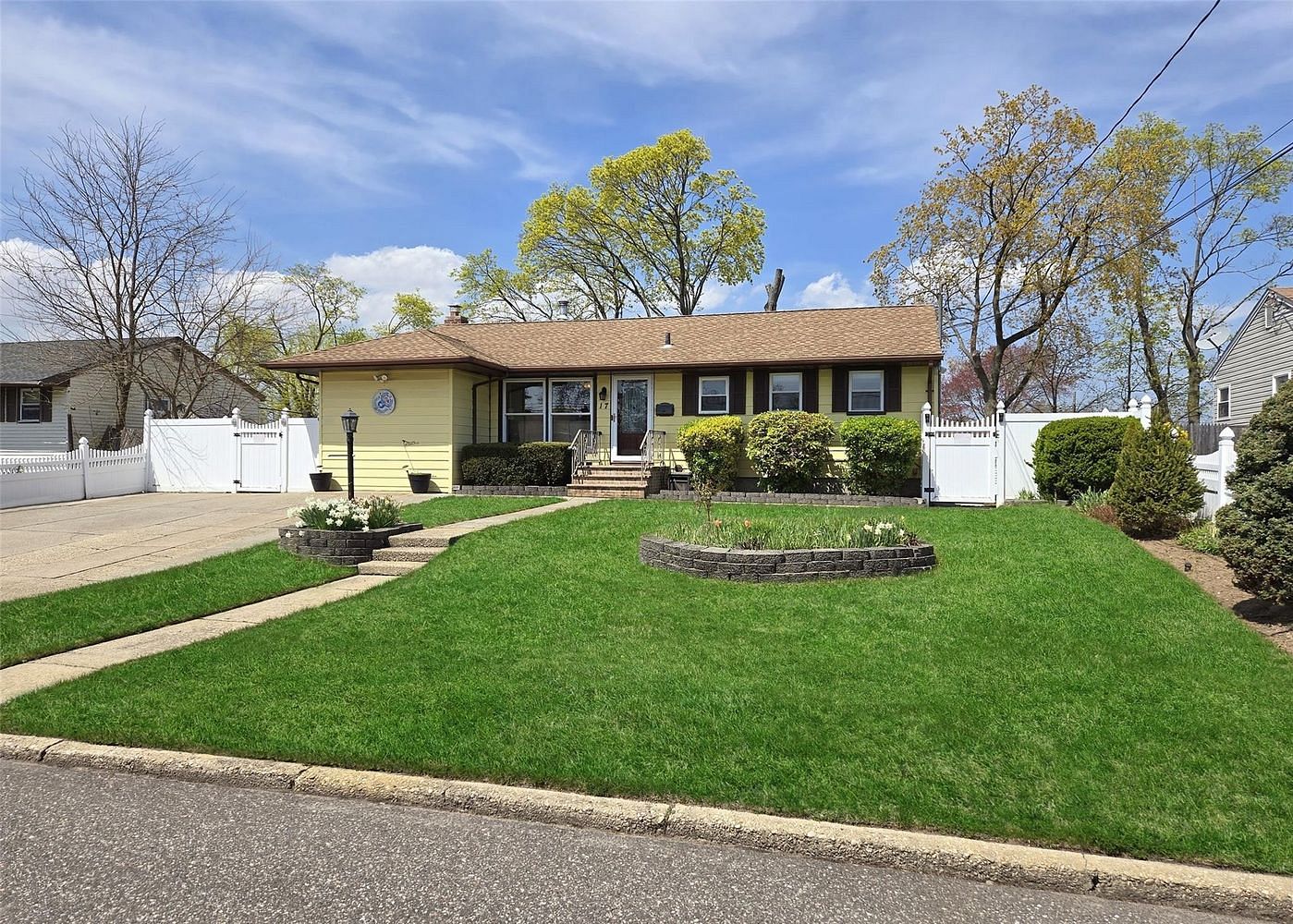 Lovely Ranch With Nice Curb Appeal & Plenty Of Room For All! Spacious Living Room With Crown Molding, Woodburning Stove, & Wood-Like Flooring. Banquet Sized Formal Dining Room With Wood-Like Flooring - Great For Entertaining Guests. Large Eat In Kitchen With Granite Counters, Tile Back Splash, Stainless Steel Appliances, Tons Of Gleaming Wood Cabinets For Storage, Tile Flooring, & Separate Dining Area With Slider To Covered Patio. Primary Bedrm With Wood-Like Flooring , Ample Closet Space, & Access To Full Bath. Updated Full Bath With Tile Flooring, Tiled Walk-In Shower, & Custom Vanity With Gleaming Cabinetry, Mosaic Tile, & Granite. 2 Additional Bedrms With Wood-Like Flooring & Ample Closet Space. Plus An Additional Bath. Enjoy A Full Finished Basement With OSE & Laundry Center. Other Features Include: Ceiling Fans, Economical 2 Zone Gas Heating, 2Yr Old Hot Water Heater, Updated Boiler, & Attic With Pull Down Stairs. Wonderful Yard Fully Fenced In Low Maintenance PVC. Huge Patio, Partly Covered For All Your Entertainment Needs. 3 Sheds Stay. Landscaped With Colorful Plants & Foliage. IG Sprinklers, Paver Front Stoop, & Oversized Driveway. Furniture Can Stay If Wanted. Close To All Major Shopping, LIRR, Highways, Public Transportation, & Airport.