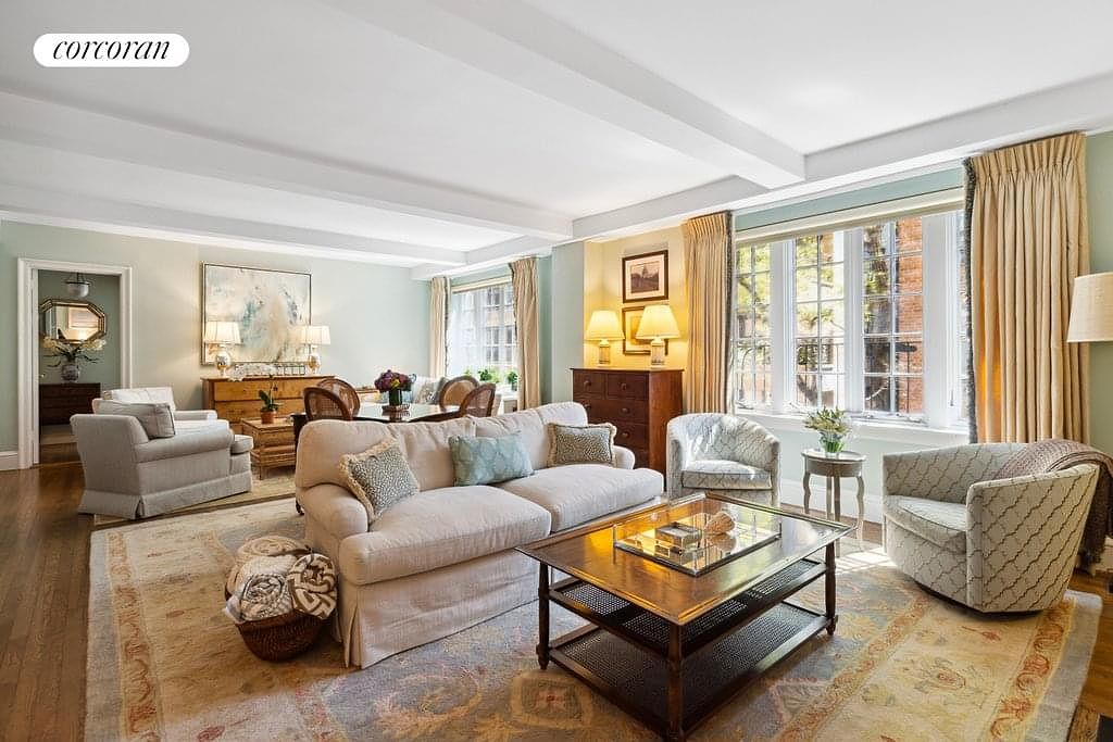 The ultimate entertaining apartment, a welcoming entry gallery is the focal point from which all public rooms are accessed and easily flow through. A 29 ft. oversized South-facing living room is bathed in sun all day and easily accommodates two seating areas; one more formal living area centered around a woodburning fireplace, and a second by the formal kitchen and dining great room, allowing for easy interaction between parties in both rooms. Two sets of large casement windows and prewar details add to the charm and wow factor of this beautiful room.