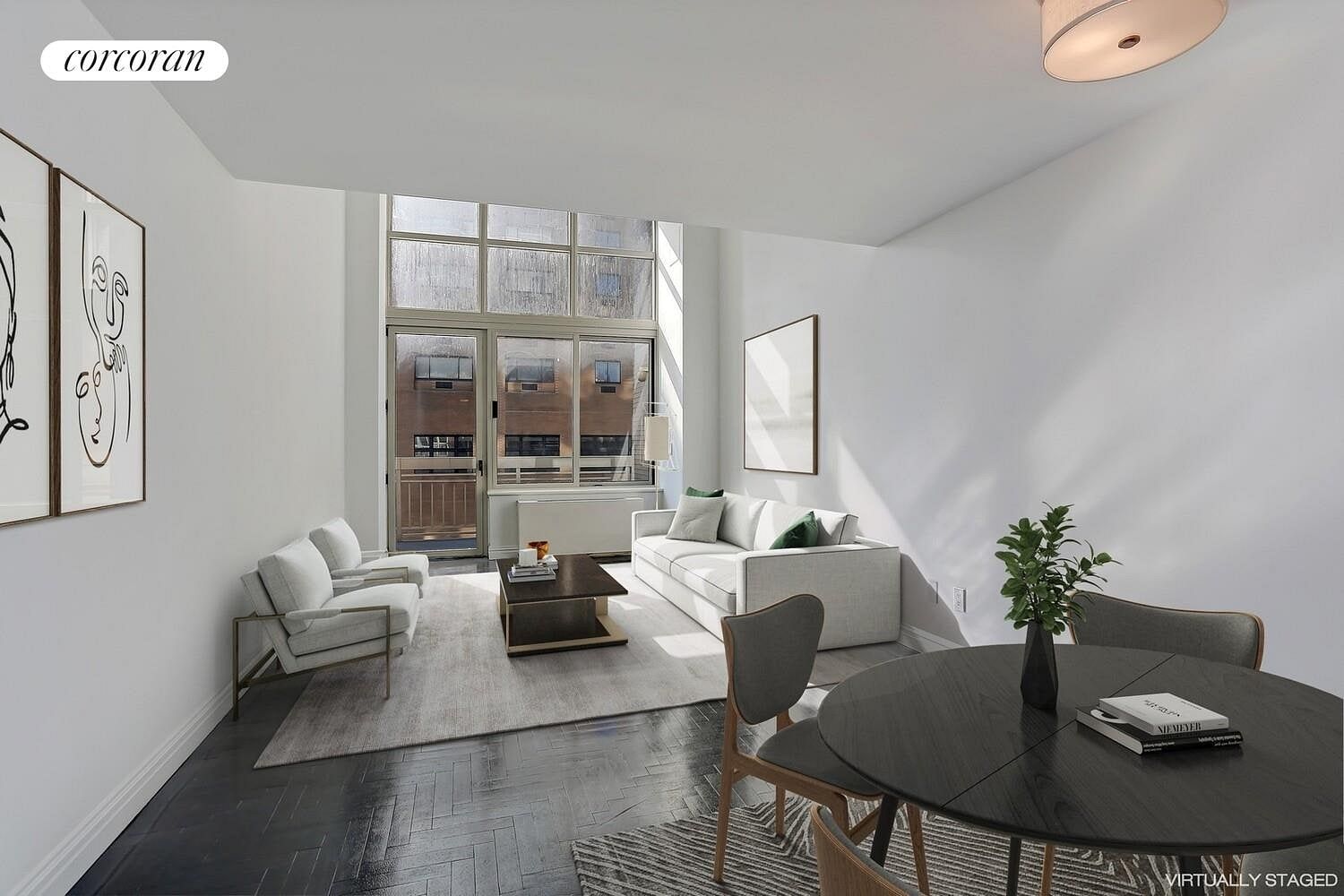 Welcome to apartment E8D at the Gotham Condominium, an 875 square foot 1 bedroom 1 1/2 bath East facing residence with a large balcony. This is a totally unique floor plan for the Upper Eastside of Manhattan with the living room, kitchen and half bath downstairs and the bedroom and full bath upstairs open to the first floor with soaring 17" high windows. It makes an amazing impression as soon as you enter this dramatic space. You will absolutely never get bored with the space.