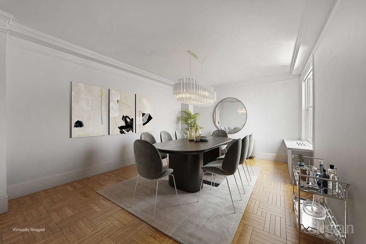 A gracious entry foyer opens into an expansive living room with leafy views over West 90th Street and glimpses of Riverside Park. The adjacent formal dining room enjoys southern light, ideal for intimate or large gatherings. A windowed, eat-in kitchen sits conveniently nearby and can easily be reimagined to suit modern living while retaining its prewar proportions.
