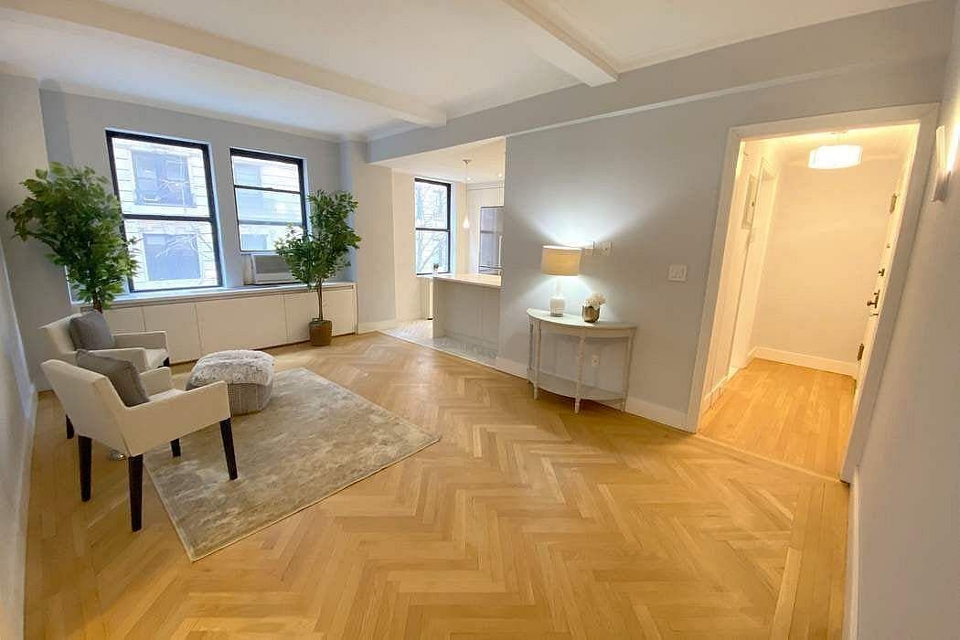 Feel right at home in this sunny, fully renovated and spacious corner pre-war one bedroom, one bath. The many wonderful features include spacious rooms, oversized windows, ample closets, gorgeous herringbone wood floors and high beamed ceilings. You'll enjoy the windowed eat-in chef's kitchen with a double stainless steel sink and appliances. Many built-ins, 4 closets finished with ample shelves and thru wall a/c.