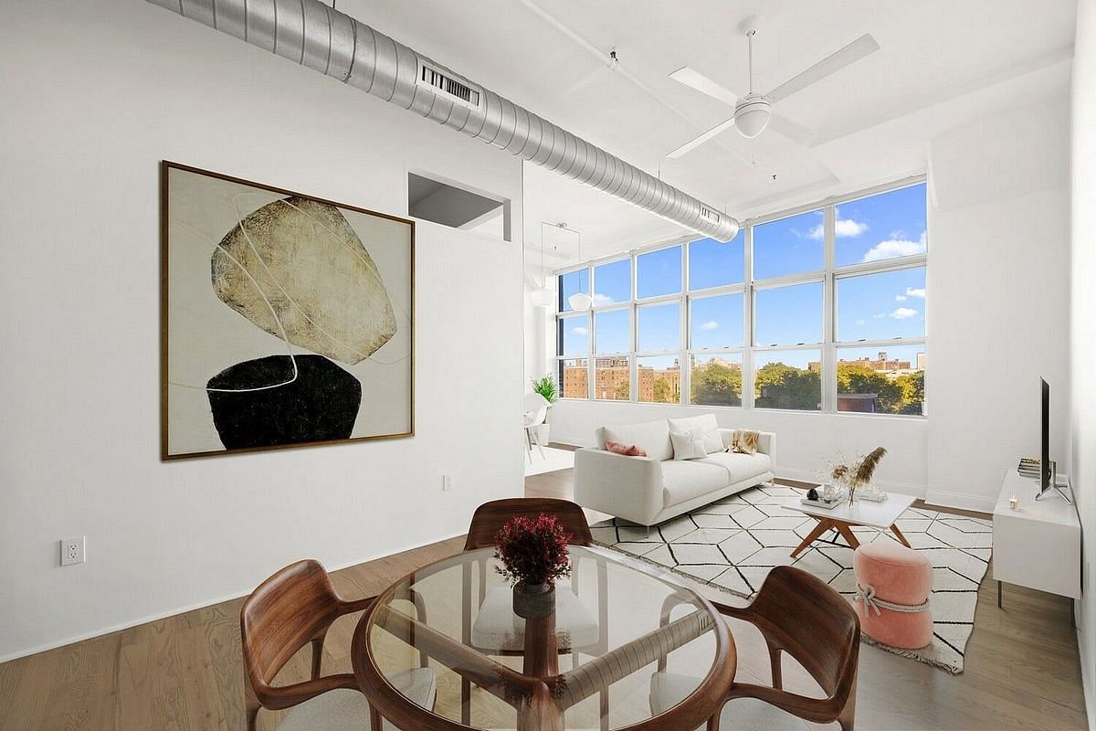 Welcome home to this extraordinary, expansive, sunny and super-cool 812sf condo loft with a wall of windows, 11ft ceilings, concrete column, original oak floors, industrial touches, in-unit laundry, central heat/ac, incredible city views and an unbeatable ambience at the historic Toy Factory Lofts in Downtown Brooklyn! Glorious all-day sunshine pours in through oversized double-paned windows looking out toward the southeastern horizon. This expansive open floor plan offers distinctive areas for separate living, dining, sleeping, working and relaxing. The enclosed sleeping loft fits a queen bed and provides ample extra storage.