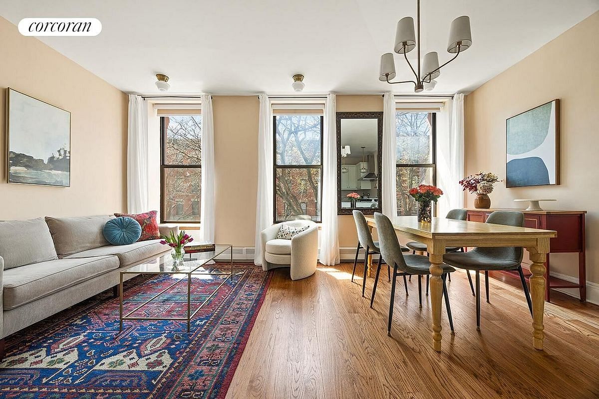 Set in a charming turn-of-the-century brownstone, this beautifully proportioned home features 9-foot ceilings, lovely prewar detail, low monthly fees and a smart, comfortable layout designed for both everyday living and entertaining. The south-facing living and dining room is flooded with light throughout the day from three oversized windows stretching across the width of the 20-foot-wide building.