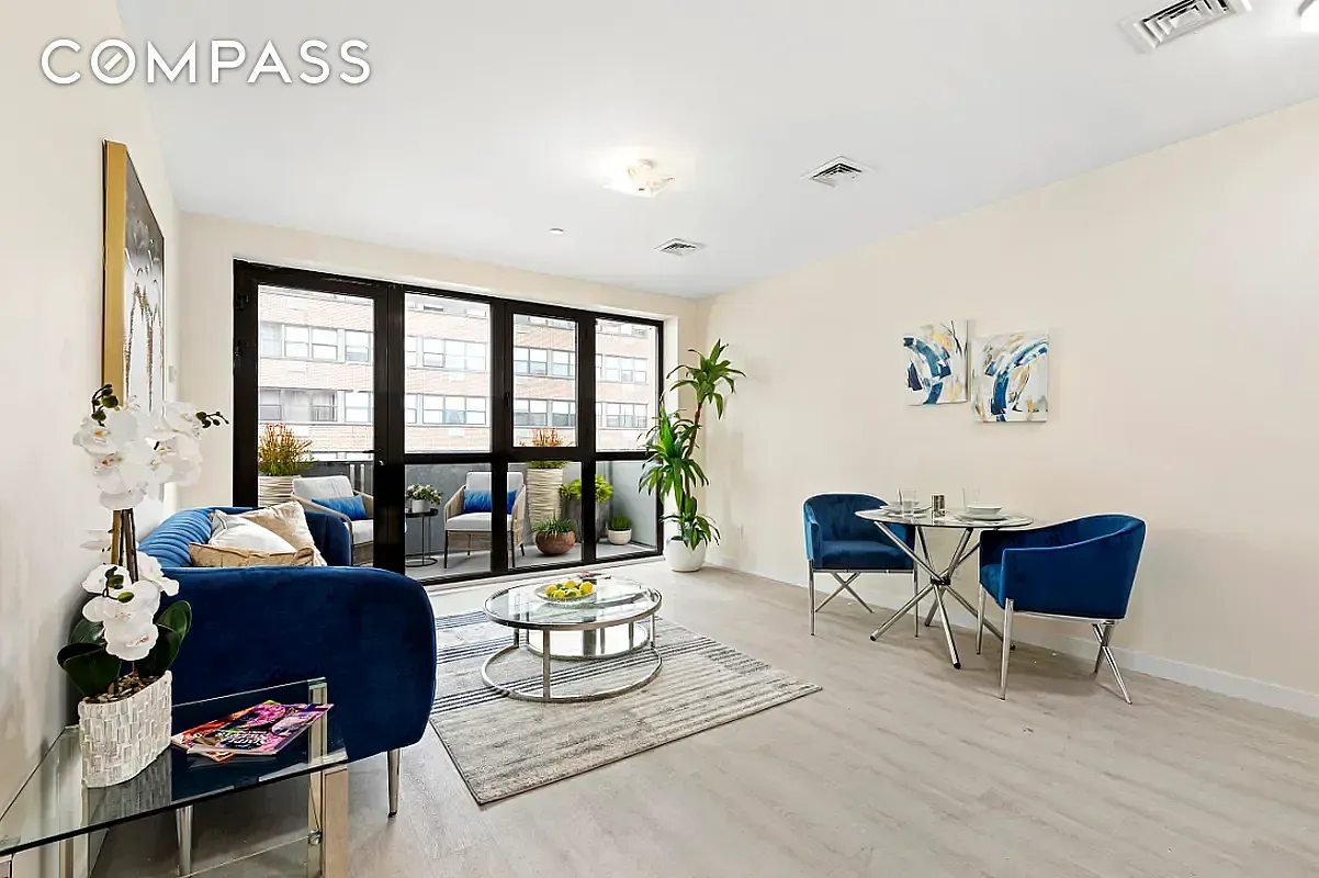 Step through the welcoming entryway into a sun-drenched, open-concept living area where light-toned wide-plank flooring creates a sense of expansiveness. The private balcony extends your living space outdoors, offering the perfect setting for morning coffee or evening relaxation.