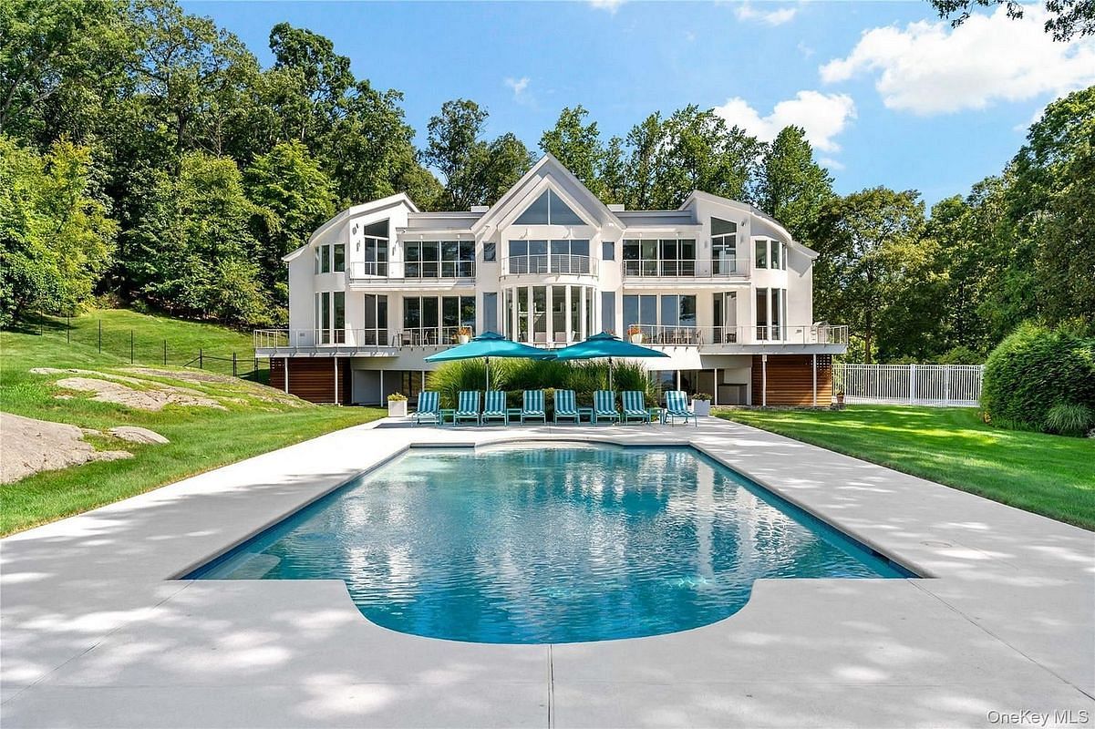 Beautifully sited high above the Hudson river, this architectural masterpiece offeers truly sweeping river views and views of the Manhattan Skyline across 14 private acres. Spanning approximately 7,900 square feet the residence seamlessly bends striking design with natural beauty, creating a one-of-a-kind retreat defined by space, light and unparralledled scenery. Designed by a celebrated Architect. Soaring 12' ceilings, floor to ceiling glass walls which bring the outdoors in. Extensive decking and terraces. Incredible flow from the entry to the living room, dining room, chefs kitchen, family room, library & library. 5 ensuite bedrooms on the second level including the primary suite with 28 foot ceiling height - 2 full baths and oversized walk in closets. The garden level has walk out access to the covered terrace and pool. The space features an oversized gym, media room, recreation room, 2 changing cabanas and an entertainment kitchen. This home will capture your heart from the moment you entry through the gated enty and drive through the magnificent landscape. Minutes to Metro North and Hghways. This is truly a work of art that you must experience.