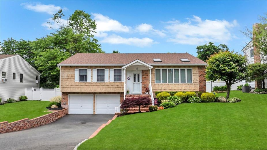 Incredible opportunity to own a magnificent, sprawling raised ranch located mid-block on a perfect flat lot in an area with underground utilities and sidewalks and within the highly desirable Smithtown School District. This home features a brand-new roof less than one year old with two skylights, a beautiful partial brick facade with front portico, and a stunning brick and paving stone front porch with oversized driveway with brick retaining walls. The backyard is a resort-style oasis with an oversized Trex deck, white railing, mature landscaping, and gas barbecue connected to propane —ideal for entertaining. Inside, a grand vaulted entry opens to an airy, open-concept floor plan with custom molding, gleaming hardwood floors, and freshly painted accents. The formal living room is filled with natural light from floor-to-ceiling windows and flows into a spacious dining room and an incredible chef’s kitchen complete with oak cabinets, granite countertops, tile backsplash, under-cabinet lighting, an enormous center island with pendant lights, stainless steel appliances, built-in microwave, gas range, electric oven, and refrigerator with built-in water dispenser. Vaulted ceilings and oversized French doors lead to the deck, while the adjacent den/family room boasts a custom granite gas fireplace with a wood mantle. The oversized primary suite includes a walk-in closet and a spa-like bath with a glass stand-up shower. Additional spacious first-floor bedrooms feature ceiling fans and easy access to a full bath with double vanity, granite countertops, dual mirrors, a tub, and a glass stand-up shower. The lower level is at grade and offers a large great room with high ceilings, recessed lighting, and an additional bedroom - perfect for extended family or guests—along with a laundry closet featuring front-loading washer and dryer, and access to your oversized two-car attached at-grade garage. This home includes a one-year-young 4-ton Lennox central AC unit, a 200 AMP electrical panel with generator hookup, Wi-Fi thermostats, some smart switches, with sprinkler system and automatic garage doors on WiFi. This meticulously maintained and thoughtfully upgraded home checks every box