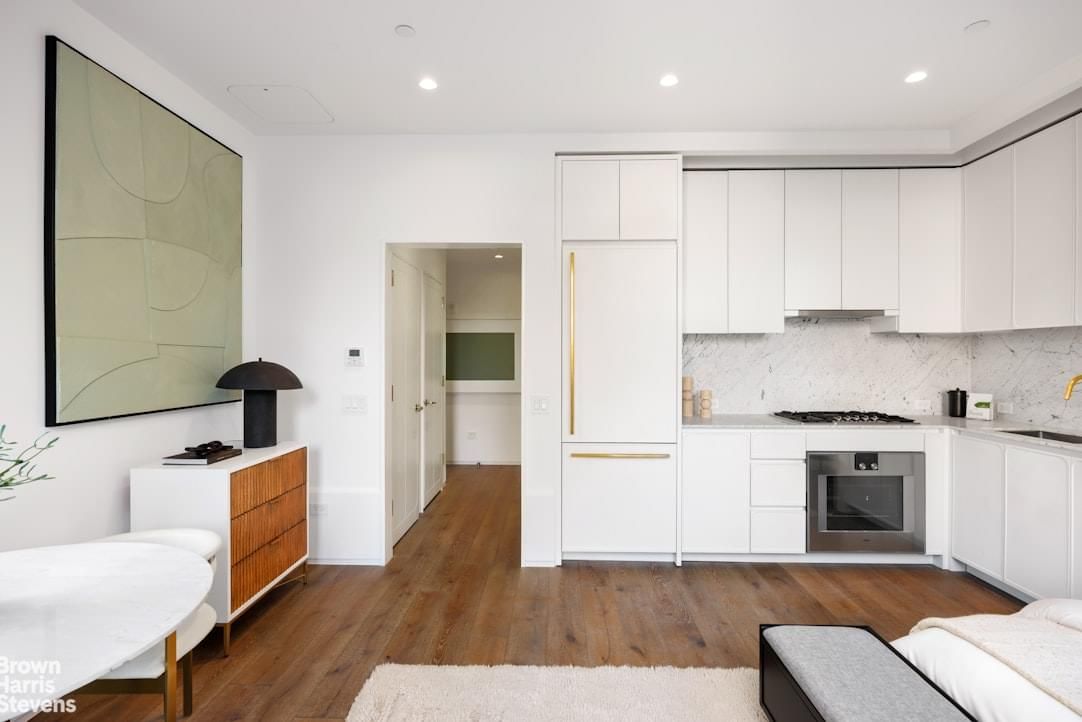This 597 square foot corner studio boasts dramatic 10-foot ceilings, and a 123 square foot private terrace facing North over tree-lined 88th Street. The kitchen was meticulously designed by Molteni & C Dada for DDG, featuring custom white lacquered cabinetry, honed statuary marble slab countertops and backsplash with brass inlays, Fantini fixtures in natural brass, and a full suite of Gaggenau and Bosch appliances.