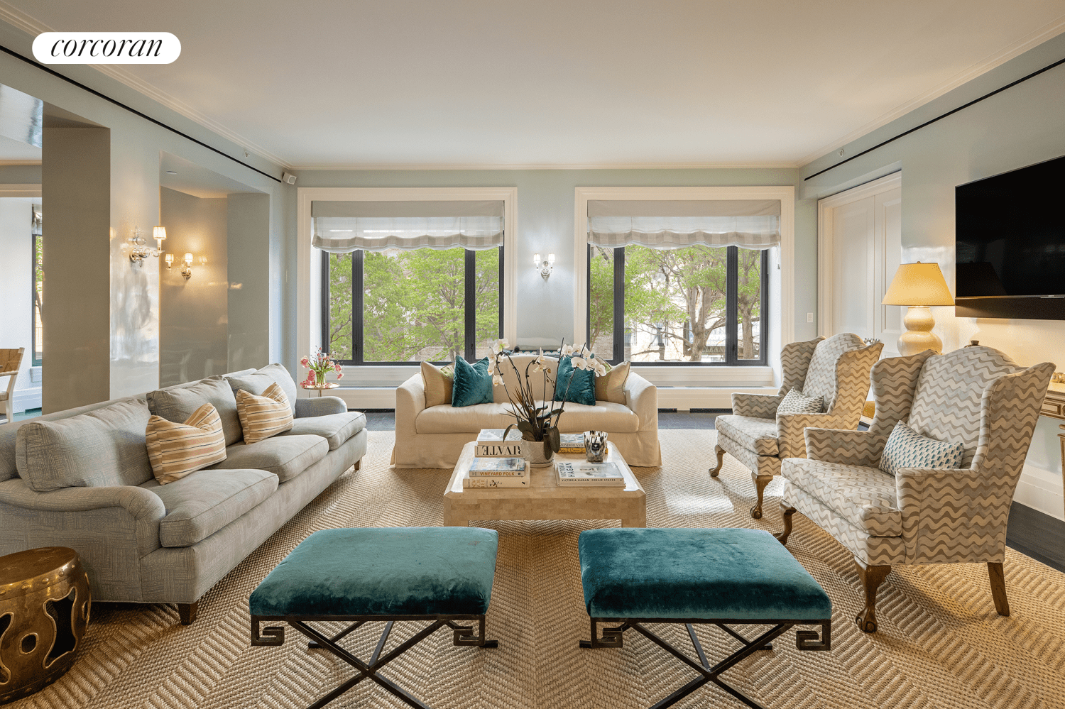 Enjoy the luxury of a private elevator landing ensuring both privacy and convenience. The expansive open living and dining rooms are surrounded by oversized windows showcasing picturesque street views. There is a perfect flow between both rooms creating a loft-like space designed for entertaining. Walls finished in lacquered paint and soaring 10-foot ceilings add an air of refined elegance. White-oak hardwood floors, a Crestron system for lighting and motorized shades, two-zone central air-conditioning and a Sonos music system elevate the living experience. Adjacent to the living room, the library, separated by French doors, can serve as a fourth bedroom. It includes two large windows with tree views, a full bathroom with a walk-in shower and radiant heated floors, and ample storage space.