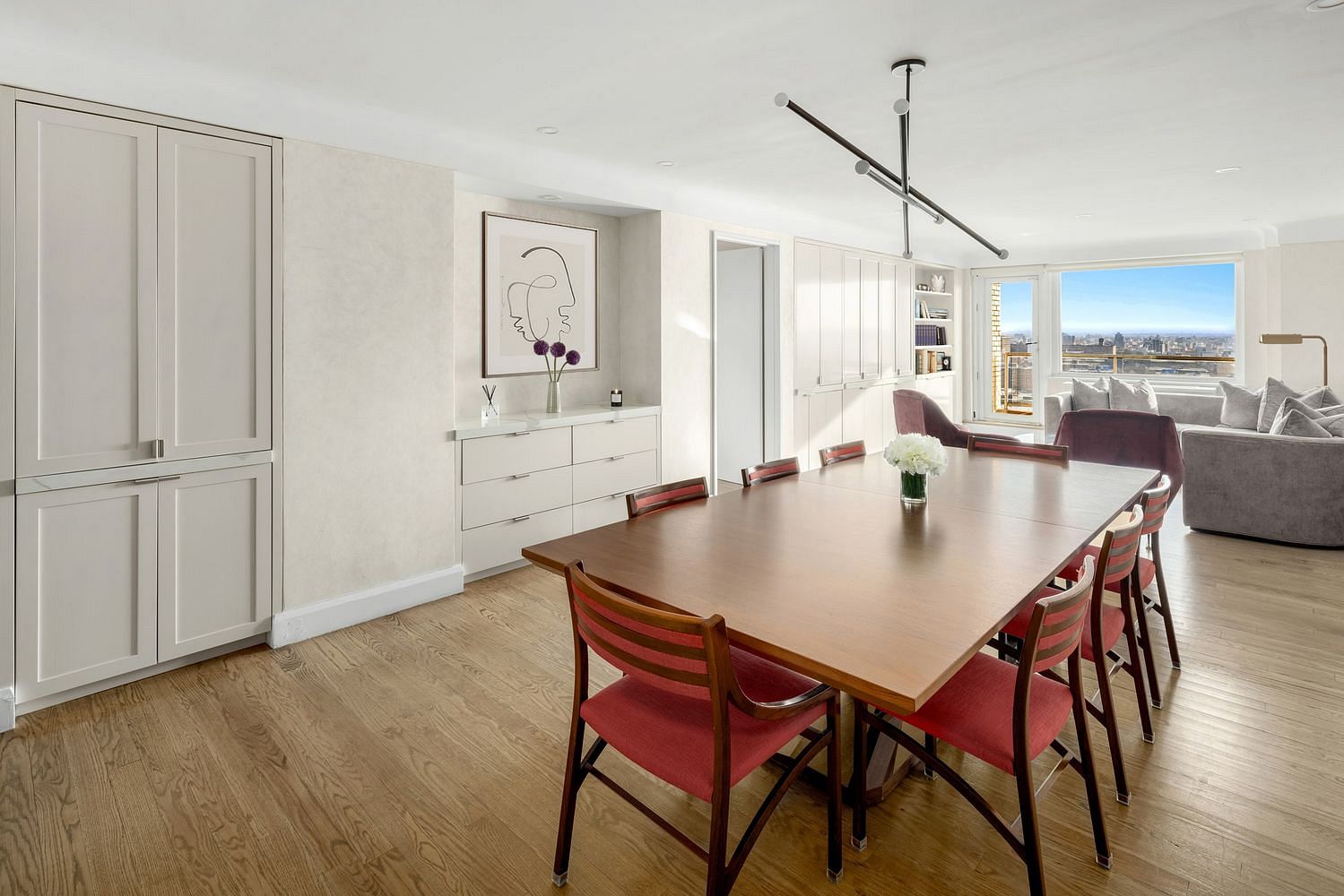 The spacious eat-in kitchen boasts top-of-the-line appliances by Wolf and SubZero, as well as crisp, contemporary marble counters and a large breakfast island with ample storage. A built-in banquette affords ample space for casual dining with bright northwest views and a large walk-in pantry allows for over?ow food storage. The huge, sunlit living/dining room features chic, discreet custom-cabinetry and opens onto an east-facing balcony that overlooks the East River, with direct views over Gracie Mansion.