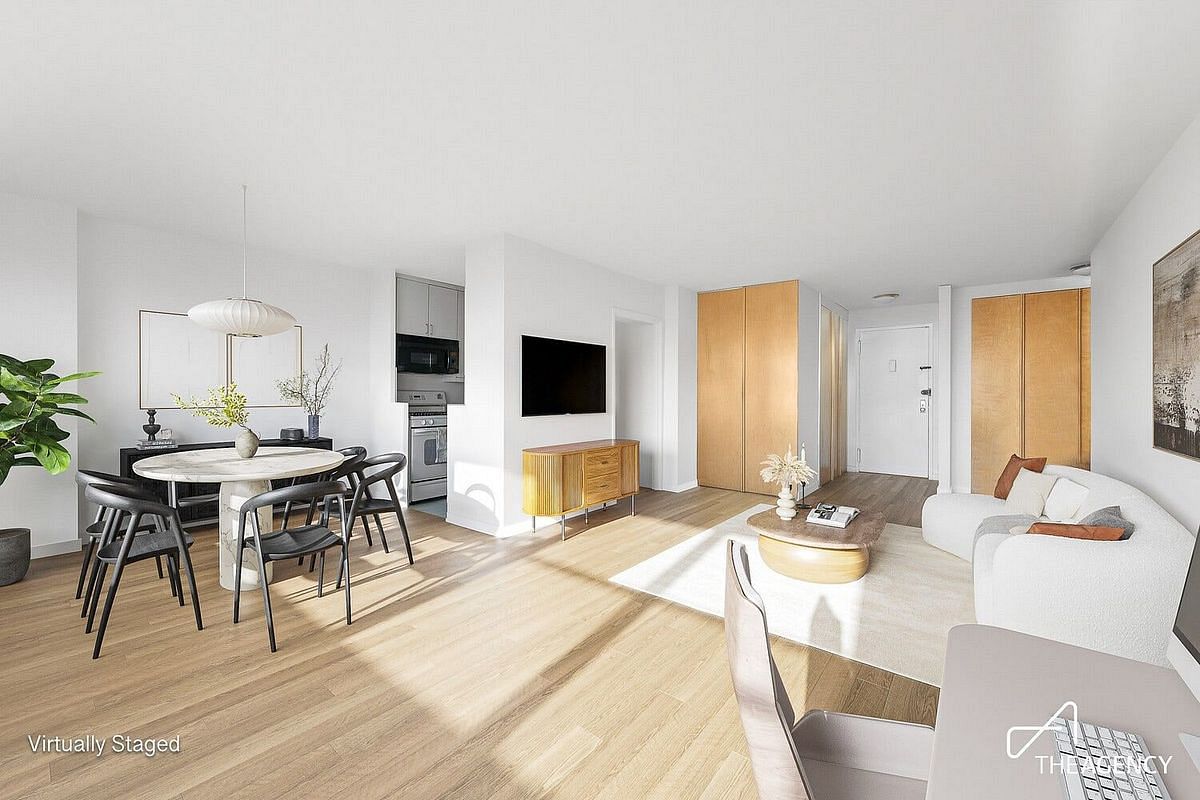 This spacious 1 BR apartment with a dining alcove was upgraded some time ago, but its pricing accommodates a complete renovation tailored to your specific tastes and requirements. With great closet space including a large walk-in, a wrap-around kitchen, lovely, open City views looking north over PS 199, the ability to create a second bedroom and the opportunity to include your own parking space at the building's doorstep, the possibilities are endless.