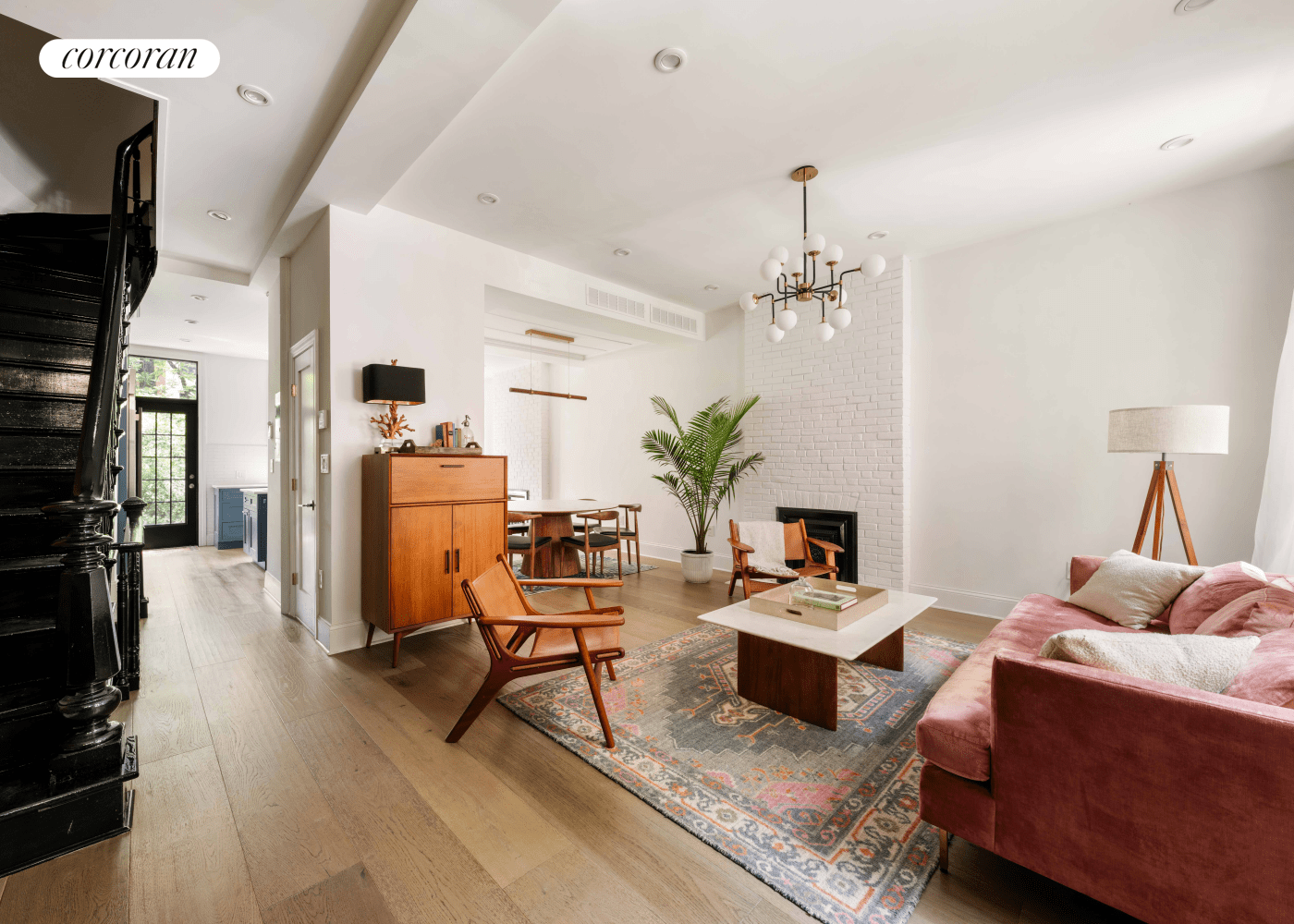 At the rear of the parlor floor, a bright, open-concept kitchen and dining area overlook a lush 60-foot garden-perfect for indoor-outdoor living. The chef's kitchen features Sub-Zero appliances, a Bertazzoni range with dual ovens and professional-grade hood, a custom pantry, and a dramatic quartzite waterfall island with a second sink! Floor-to-ceiling glass doors and casement windows flood the space with natural light and lead directly to a beautifully landscaped outdoor retreat.