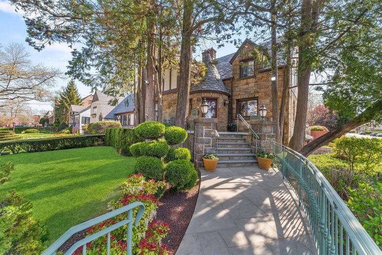 Welcome to this iconic, meticulously renovated and maintained home, fully furnished, turnkey, move in ready, blending timeless elegance with modern comforts. Set behind stunning stone retaining walls, this property boasts a grand entrance framed with flagstones, wrought iron railings, and a charming turret. A classic slate roof, copper window awnings, and extensive stonework and pavers further elevate the estate's curb appeal. Enjoy outdoor living on the front terrace or on the back deck as well as lower patio areas in the beautiful fenced-in private backyard with mature landscaping, perfect for unwinding or entertaining.