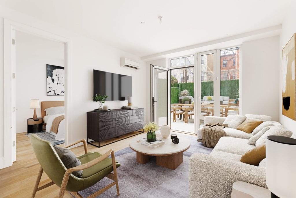 Graced with a spacious backyard and a collection of contemporary fixtures and finishes, this brand new 1-bedroom, 1.5-bathroom duplex combines urban elegance with relaxed Greenpoint living in the heart of one of Brooklyn's trendiest neighborhoods. The spacious backyard is perfect for alfresco dining, sun lounging, urban gardening, outdoor crafts, and more. Wide plank oak floors sit beneath airy ceilings over 9 ft. in height. Double-pane floor-to-ceiling windows let in plenty of natural light while keeping interiors warm and quiet.