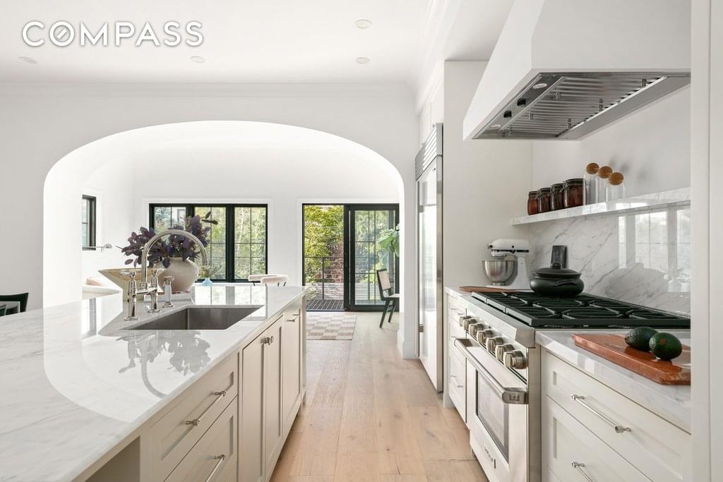 Inside, graceful architectural arches define the transition between living and dining areas. The thoughtfully designed chef's kitchen includes floor-to-ceiling cabinets for ample storage, with outlets built-in for all your small appliances, and an enormous island that invites people to gather into the space.