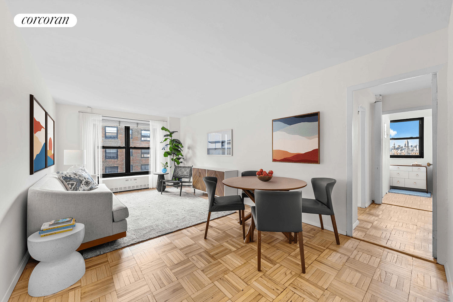 This high-floor residence in the heart of historic Clinton Hill offers stunning views stretching from Lower Manhattan to the Williamsburg Bridge. The oversized living-room, featuring a large picture window, easily accommodates both living and dining areas, with extra room for a home office or workspace. The charming vintage kitchen is ready for your personal touch, while the bathroom retains its original pre-war tile. The corner bedroom allows you to wake up to city views from both windows and provides ample space for a full-size bed, and a desk or dresser. With five windows, two exposures, and three closets, you'll enjoy plenty of natural light and storage. Plus there is a windowed dressing area, and beautifully refinished oak flooring runs throughout.