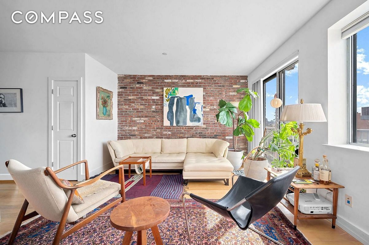 Keyed-elevator access brings you directly into this sun-flooded home with exposed brick and hardwood floors, perched above a tree-lined Spencer Street. The west-facing balcony off the living room offers unobstructed, panoramic views of Manhattan, from the Freedom Tower to the Empire State Building - ideal for sunsets. Theres an easy flow to the open-plan layout, moving through the kitchen to the east side of the apartment, where morning light floods into a dining area, naturally doubling as a home office.