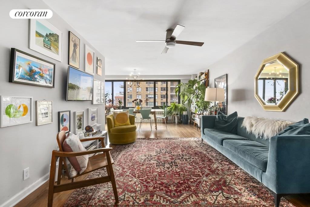 The very rare true three-bedroom, two full-bath apartment is now available at Willoughby Walk, venerable twin co-op buildings in the heart of Clinton Hill. Situated on the tenth floor, this expansive, brightly lit apartment has the layout and proportions to provide luxurious living for many years to come. A generous entry closet affords plenty of storage for coats, gear and extra pantry items. You'll be stunned by the sunlight that streams across and through the living and dining areas from a full wall of southeast-facing windows. Still working remote? A perfect study area off the living room makes that a breeze with plenty of room for all the accoutrements your business might require. Substantially sized, the living room will support your dream couch and TV setup with plenty of space left over for bookshelves and occasional tables. Seat your dinner guests at a table that offers plenty of elbow room and is proximal to the beautifully renovated galley kitchen, which extends gracefully to the windows. Upper and lower cabinets are painted a muted grey-blue and the delicate white subway tile backsplash is a perfect pairing. Bosch dishwasher, double stainless sinks, a five-burner stove and granite counters make the kitchen as handsome as it is functional. The GE fridge with French doors and ice maker is smartly located at the end of the kitchen, maximizing the work area while keeping the busy appliance at arm's length. Bedrooms two and three are well-sized, and each has a double closet and a half wall of windows. The hallway bath has a soaking tub and a lively starburst patterned tile. The primary bedroom is wide enough for even a California king bed, double closets and an en suite windowed bath with a step-in shower. Savor Brooklyn and Manhattan views from the 90sqft balcony: a getaway with a book and a cup of coffee or a place to unwind with a glass of wine after a hectic day. Bamboo floors, white walls and ceiling fans complete the picture-perfect corner apartment. The full-service building is pet-friendly, has a 24/7 attended lobby, a well-appointed laundry room, an on-site playground and employs a full-time super/maintenance team. There is parking and additional storage for rent (currently waitlisted). Located conveniently between Clinton Hill and Fort Greene, there is so much to enhance your daily life: Fort Greene Park, the farmers market, Willoughby Avenue Open Streets, world-class art at the Pratt Institute Sculpture Park, and notable restaurants, like LaRina Pastifico, Evelina, Locanda Vini e Olii, Casa NoNo, Terra 21, to name a few. Key Food, a post office, and various transportation options are located nearby. First showings commence May 13 & 14.