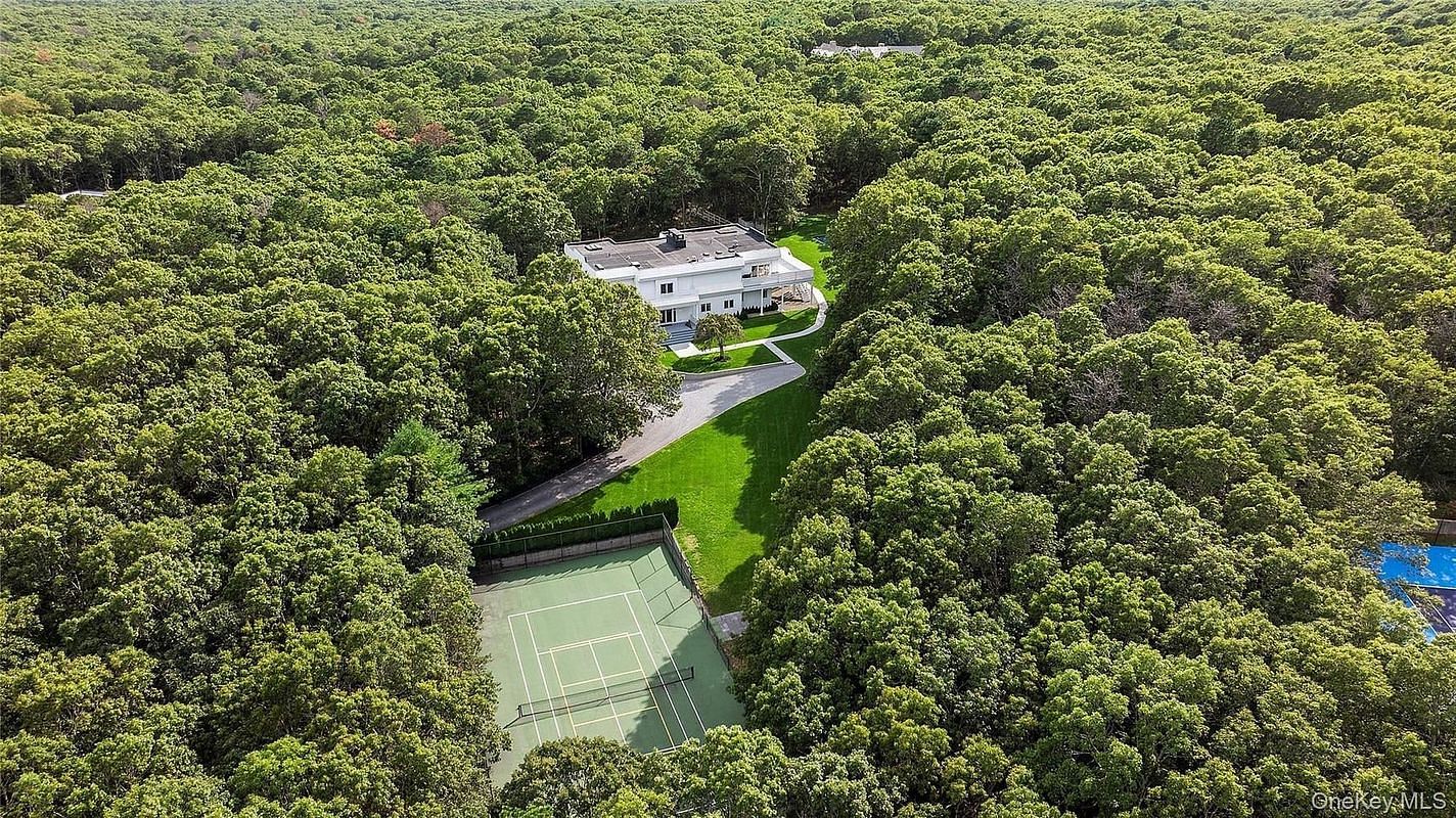 Think out of the box and live it up in your own 9,000 sqf Hampton Oasis (Private Retreat) strategically designed and positioned on over 10 acres of serene natural privacy with an all-weather tennis court, a 52 x 27 heated gunite pool, a Sunset Beach-inspired 2-level Hampton Cabana, and so much more. Truly unique, elegant, and very spacious, this 6-bedroom, 7-bath residence is equipped with an elevator connecting all 3 levels and a 4-car garage. This modern architectural gem underwent a stunning (meticulous) 2019 gut renovation throughout, including a high-end custom professional chef's kitchen with top-of-the-line stainless steel appliances, a 20-foot bar, 2 sets of Wolf ovens, 2 sets of Miele dishwashers with a Sub Zero induction station, a Sub Zero refrigerator, as well as a generous walk-in pantry with a sink for the most discerning chefs and entertainers alike. This spectacular residence further offers 2 sets of wet bars, one on each floor, equipped with its own Subzero wine coolers and freezers, and 2 sets of full laundry rooms, as well as a state-of-the-art built-in sound system and a state-of-the-art Lutron light system throughout the entire residence. An additional kitchen for your guests on a separate floor adds to the entertainment on a large scale. A dramatic glass atrium stretches to an elegant dining room with a stately double-sided wood-burning fireplace, soaring 38 x 42 living room, where all seamlessly merges for an ultimate enjoyment of this unique sun-drenched warm space elegantly lit by multiple sky windows and oversized glass windows and doors with sweeping views of the property and nature in all its glory. Multiple generous en suites are complemented by high-end steam showers and luxurious private baths. A 3,000-square-foot wraparound deck stretches across two levels, offering panoramic views of the surrounding natural beauty and a spectacular sun-tanning experience. The luxurious primary suite is its own private and serene retreat, featuring a spa-like bath, luxurious steam shower, and direct access to a private deck. The lower level features an infrared sauna adjacent to a full bath with a steam, a full workout gym with a meditation and playroom area, a walk-in cedar closet, and this one-of-a-kind gem renovated with family, entertainment, health, fitness, fun, and K9 in heart is the ultimate dream for dog and nature lovers with its custom-designed luxurious K9 feeding and grooming room, which opens up directly to a private, fully fenced-in, lush 0.25-acre dog run and play area, further accompanied by a one-mile trail through the property. Your private Hamptons resort with Central Park-like grounds, just minutes to the bay or ocean, is conveniently located near some of the best hiking and biking trails in the Hamptons, as well as the very best of shopping and dining, just moments from the Villages of East Hampton and Sag Harbor. This is more than just a home-it's a rare, turnkey retreat where timeless design, unmatched privacy, and a prime location come together in perfect harmony.