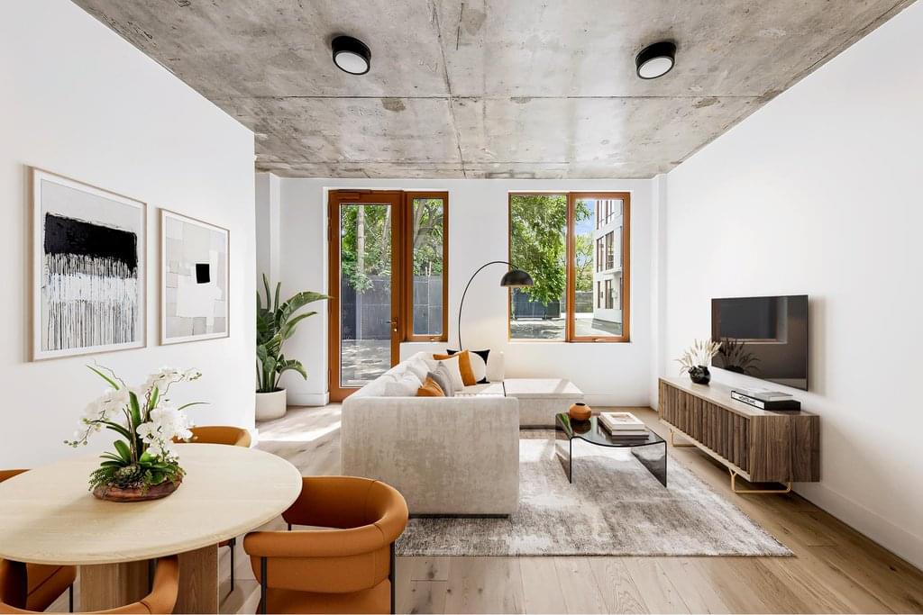 Townhouse B is a stunning 2 bed, 2.5 bath residence with abundant natural light and a beautiful 170 sqft private garden. As you enter into the open concept first floor, you'll notice luxe details like the madera white oak, wide-plank wood floors, oversized windows and 10ft exposed concrete ceilings.