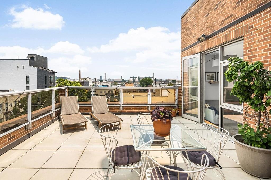 Prime Greenpoint two-bedroom/one-bathroom penthouse with excellent light, huge private terrace, included storage, and deeded parking available for purchase in the 15-residence elevator condominium, 199 Huron Street.