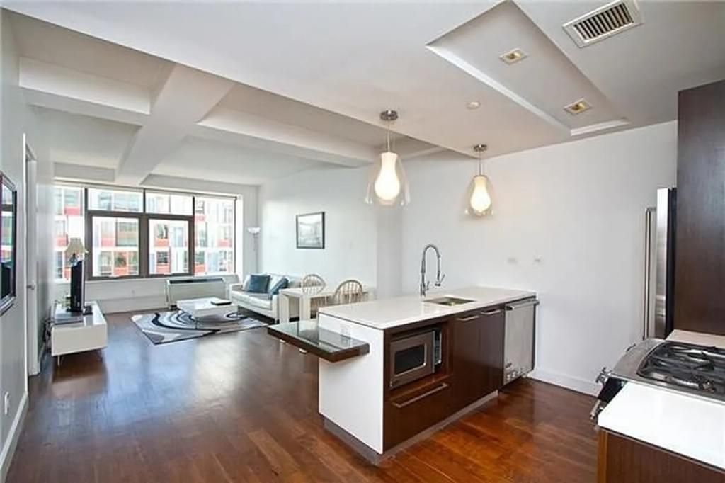 At 791 sf, the apartment offers plenty of living space including a 21-foot living room and an enormous 15 x 12 bedroom with walk-in closet. Youll want to host a dinner party or two to showcase your beautiful chefs kitchen with white lacquer cabinetry, quartzite stone countertops and Viking appliances.