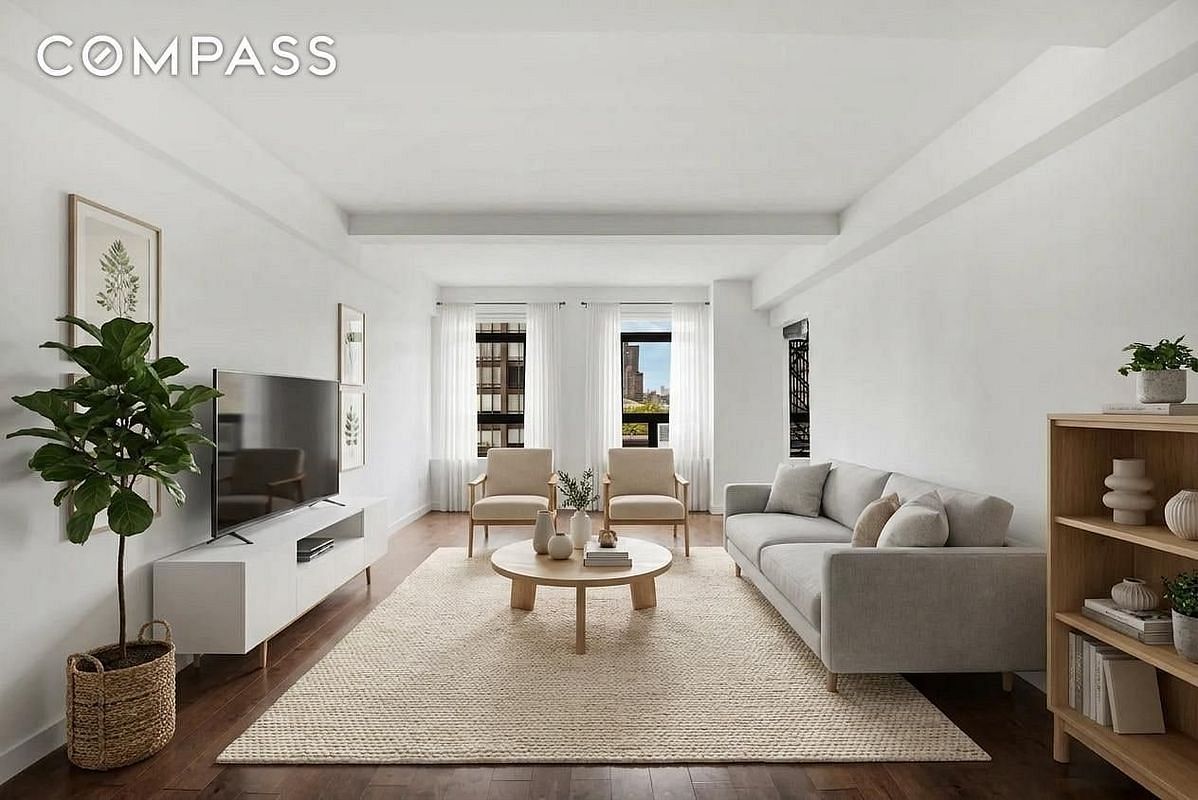 The furniture in the photographs has been virtually staged; the apartment is shown in its true condition.