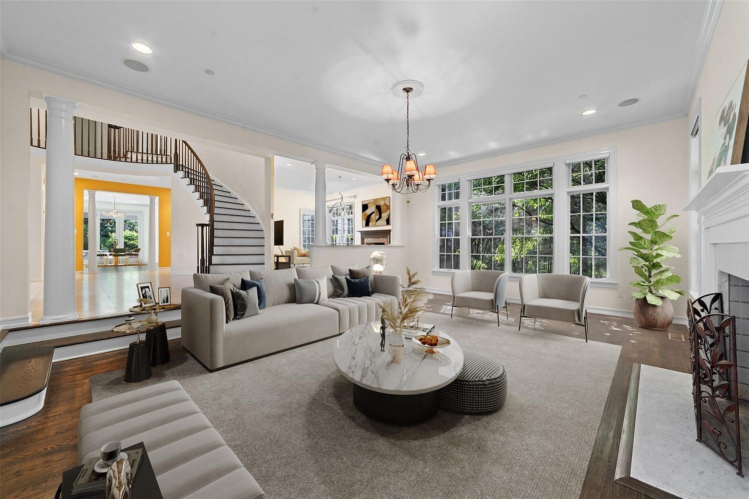 This exceptional custom colonial in Legend Hollow is nestled at the end of a private cul-de-sac, offering both privacy and elegance. Upon entering, you’re greeted by a stunning limestone foyer with soaring ceilings and a magnificent quarter-turn spiral staircase. To one side, a refined library with a wet bar sits adjacent to the formal living room, creating the perfect space for both relaxation and entertaining. The gourmet kitchen is a chef's dream, featuring an oversized island and an open-concept layout ideal for hosting guests. Upstairs, the luxurious primary suite boasts a vaulted ceiling, a cozy fireplace, and a sunken den or office. The ensuite bathroom offers a spa-like experience with a steam shower, jacuzzi tub, and separate double vanities. The 5th bedroom, located above the three-car garage, includes its own living area and a full bath, making it the perfect guest suite. The remaining bedrooms are all en suite, with one featuring its own fireplace for added charm. Step outside to discover a resort-style backyard, complete with a custom gunite heated pool, jacuzzi, and waterfalls. Surrounded by professionally landscaped gardens, this outdoor space offers a peaceful, Zen-like atmosphere. There’s also a dedicated seating area, perfect for summer entertaining. This home is the epitome of luxury living, combining sophistication with comfort at every turn.