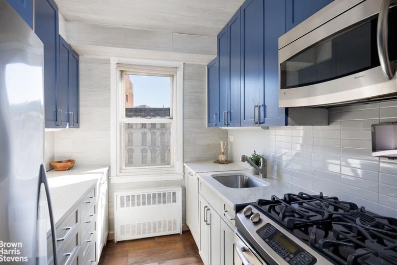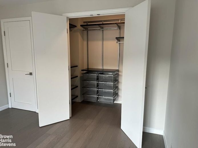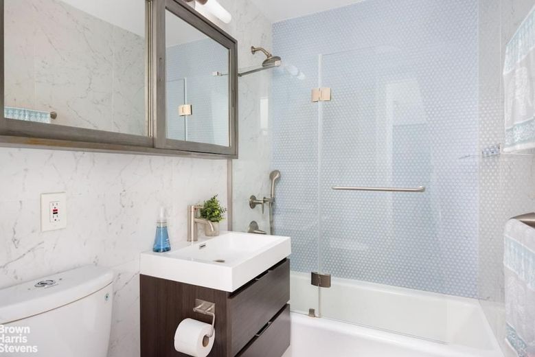 Barely lived in since a full do-over, the apartment features east-facing windows (a glimpse of uptown's Empire State Building), a sizable dining alcove, storage space galore and a washer/dryer. The details are all tasteful and high end: shades of calming blues and greys resonate throughout, complimenting the white oak engineered floors. The kitchen features heat and stain resistant quartzite countertops; a subway tile backsplash; new blue two-toned custom cabinet doors. There are new doors throughout the unit, all with satin finish handles; the bathroom has Carrara marble walls and matte finish grey porcelain floors which are slip resistant. The closets are ALL walk-in, with custom cabinetry from the Container Store and all light fixtures are fitted with dimmers.