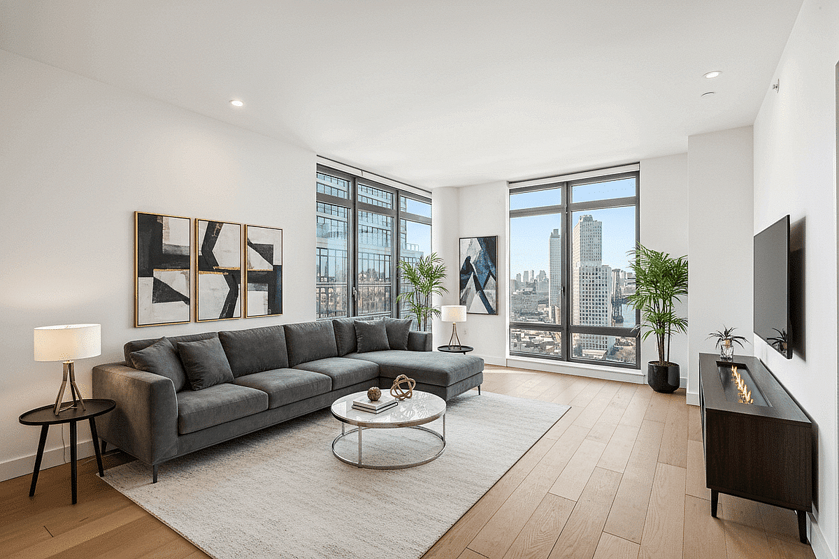 The Living Space: An expansive living area flows seamlessly onto your private balcony, the perfect perch for morning coffee or sunset cocktails over the East River.