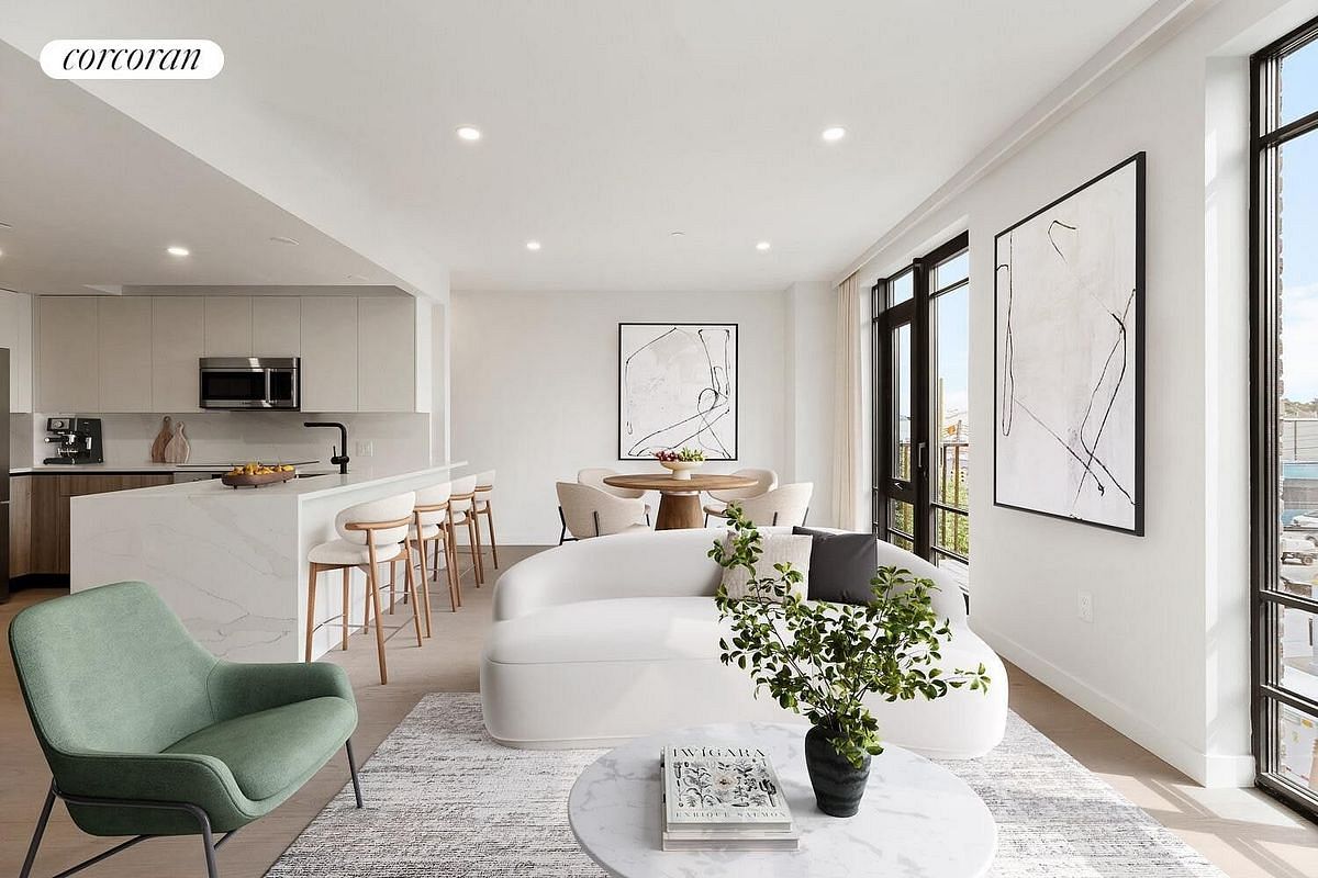 The open living and dining room offers a meticulously designed kitchen featuring custom European cabinetry, quartz waterfall countertops and backsplashes, Grohe fixtures, and premium stainless-steel Bosch appliances, including a Blomberg refrigerator. A private balcony extends off the living room.