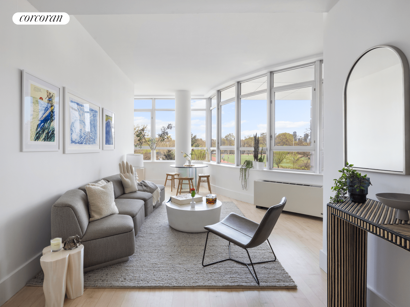 Inside the apartment, you're welcomed by a dramatic wall of 12 windows that frame McCarren Park and flood the space with natural light throughout the day. Soaring 9'6" ceilings and 4 inch maple wood plank floors beneath your feet add to the airy, light feel, while the open layout offers flexibility for a dedicated workspace, sitting area, and dining nook along the window wall.