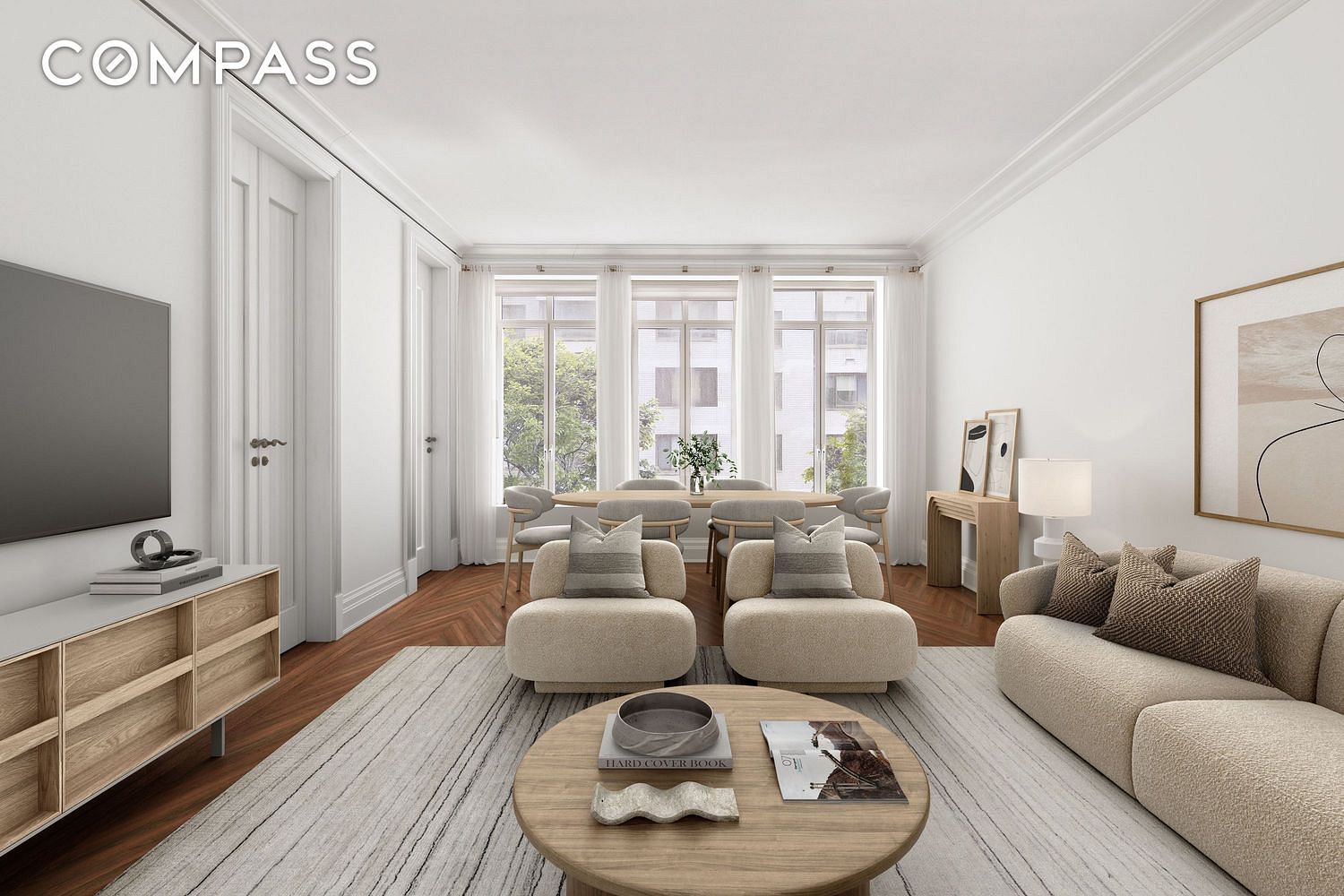 Upon entering, youre greeted by a gracious foyer that leads to an expansive living area and a separate, windowed dining room perfect for creating memorable moments with loved ones or hosting gatherings. The impressive triple bay window bathes the space in beautiful south-facing natural light, highlighting the exquisite herringbone-patterned oak flooring and custom moldings that exude timeless charm.