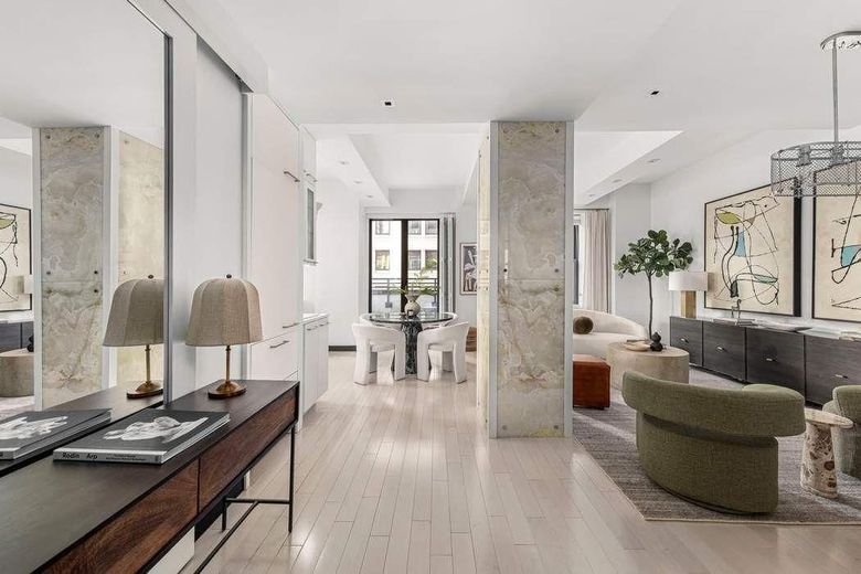 Welcome to the epitome of luxury living at 20 Pine Street, Unit 3001. This exquisite home greets you with an elegant entrance hall featuring a broom and linen cupboard on the right, a beautiful renovated powder room, complete with a washer and dryer, is discreetly tucked behind a sleek wood and glass sliding door. The left side boasts a large mirror that slides over an electrical sub-board and key hooks, complemented by a striking onyx-clad support pillar with LED color-changing lights.