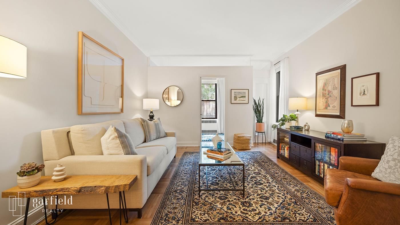 In 2022, the entire apartment was refreshed with refinished plaster walls and a full repaint, along with the installation of new crown molding and baseboards. A custom Elfa closet system was added to the hall closet for smart, streamlined storage. Throughout the home, high ceilings, elegant architectural curves, and original inlaid parquet and hardwood floorscarefully repaired and refinishedadd warmth and character. Contemporary lighting, top-down/bottom-up window shades, and hardware round out this move-in ready home.