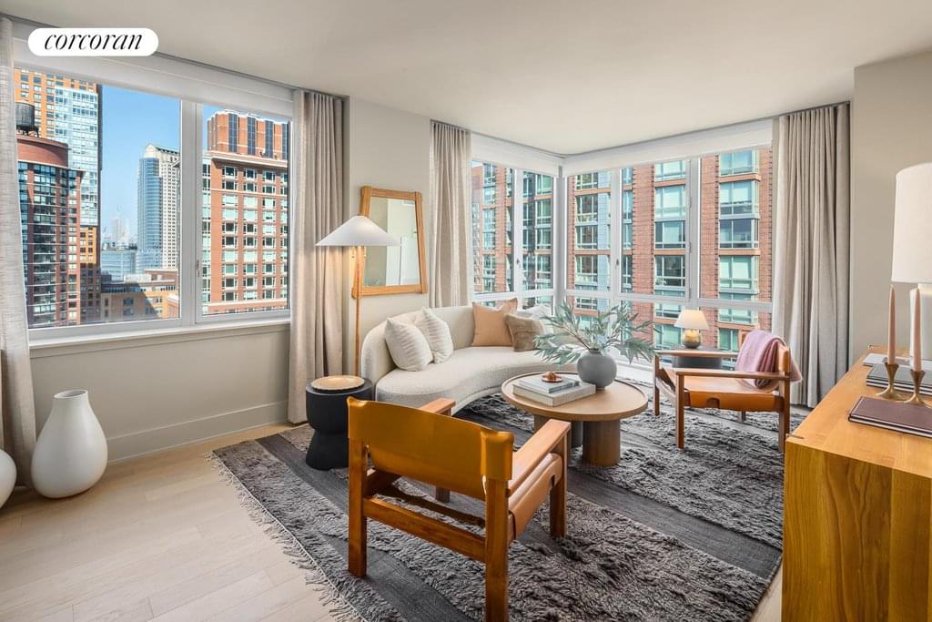 Enjoy Hudson River views and breathtaking sunsets through floor-to-ceiling windows from this sundrenched 1,594 sq. ft. northeast corner three-bedroom residence. Interiors have been designed by the acclaimed, environmentally focused architecture firm COOKFOX, and feature 4" wide plank white oak flooring in a custom satin finish, and custom Italian kitchens with matte-lacquered millwork. Beautiful and durable Quartzite slab countertops frame fully integrated Sub-Zero and Cove appliances, a Wolf range, and stainless steel Julien sink with a polished nickel faucet. Bedrooms experience an abundance of natural lights and direct views of Teardrop park. Bathrooms feature Montpellier Limestone floors and Bianco Dolomite marble walls, counters and tub skirting. The custom millwork vanity is in a limed walnut finish and has an illuminated medicine cabinet with defogging mirror above. Additional residence conveniences include a Miele washer and dryer, oversized noise reducing casement style windows with a "low-e" coating, and a four-pipe heating and cooling system that allows for maximum comfort and year-round flexibility.