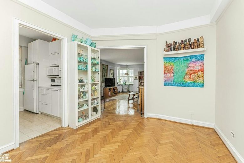 Prewar details include Herringbone hardwood floors throughout, original Bakelite doorknobs, high ceilings and plenty of closets including a large walk-in in the entry.