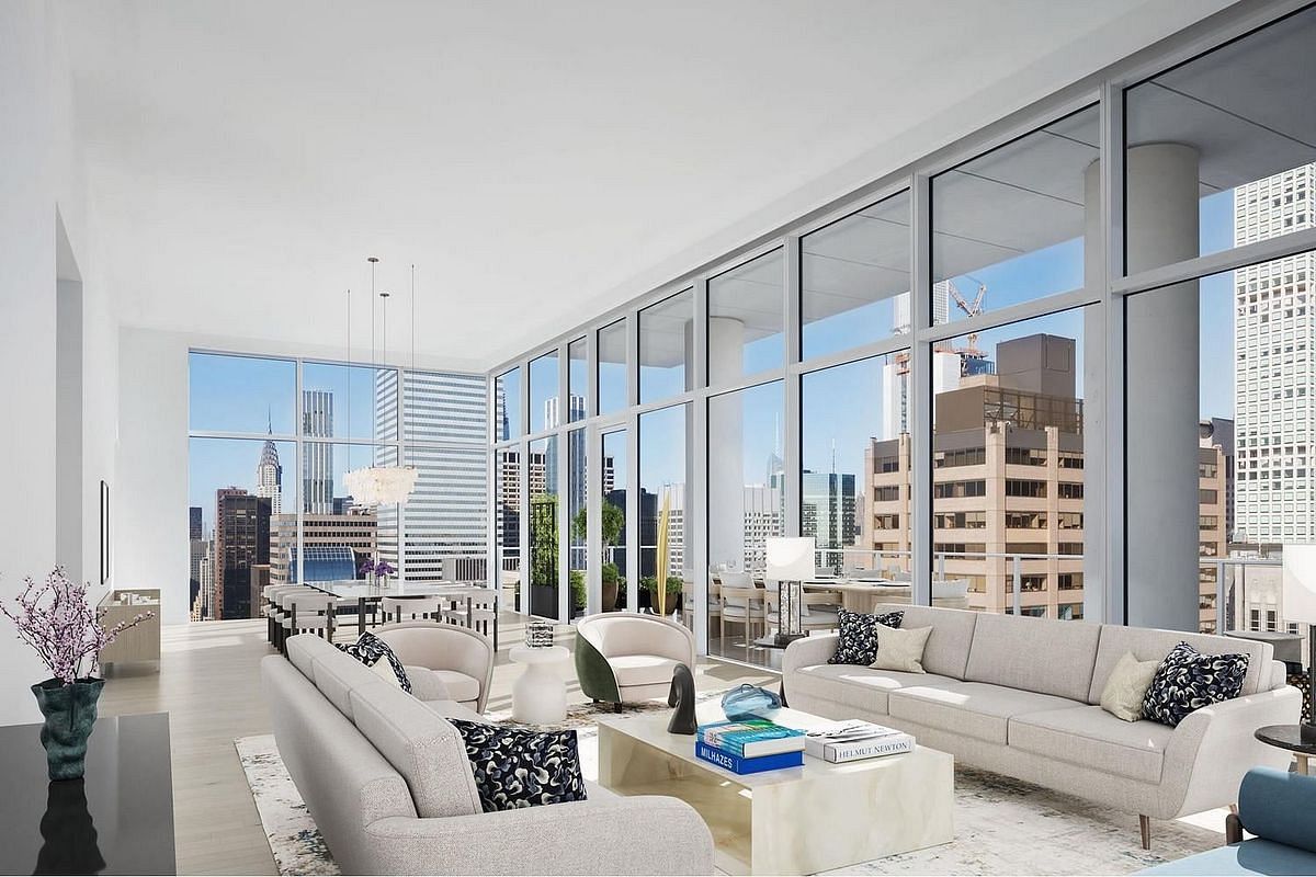 Introducing Penthouse 32, an unparalleled, three-bedroom, three and a half bath full floor residence with 14" finished ceilings, gas fireplace, and 148 linear feet of continuous terrace with 360 degree views of Central Park and the Manhattan skyline. The floor to ceiling glass windows and expansive 14" ceilings tie the inside/out living concept together perfectly.