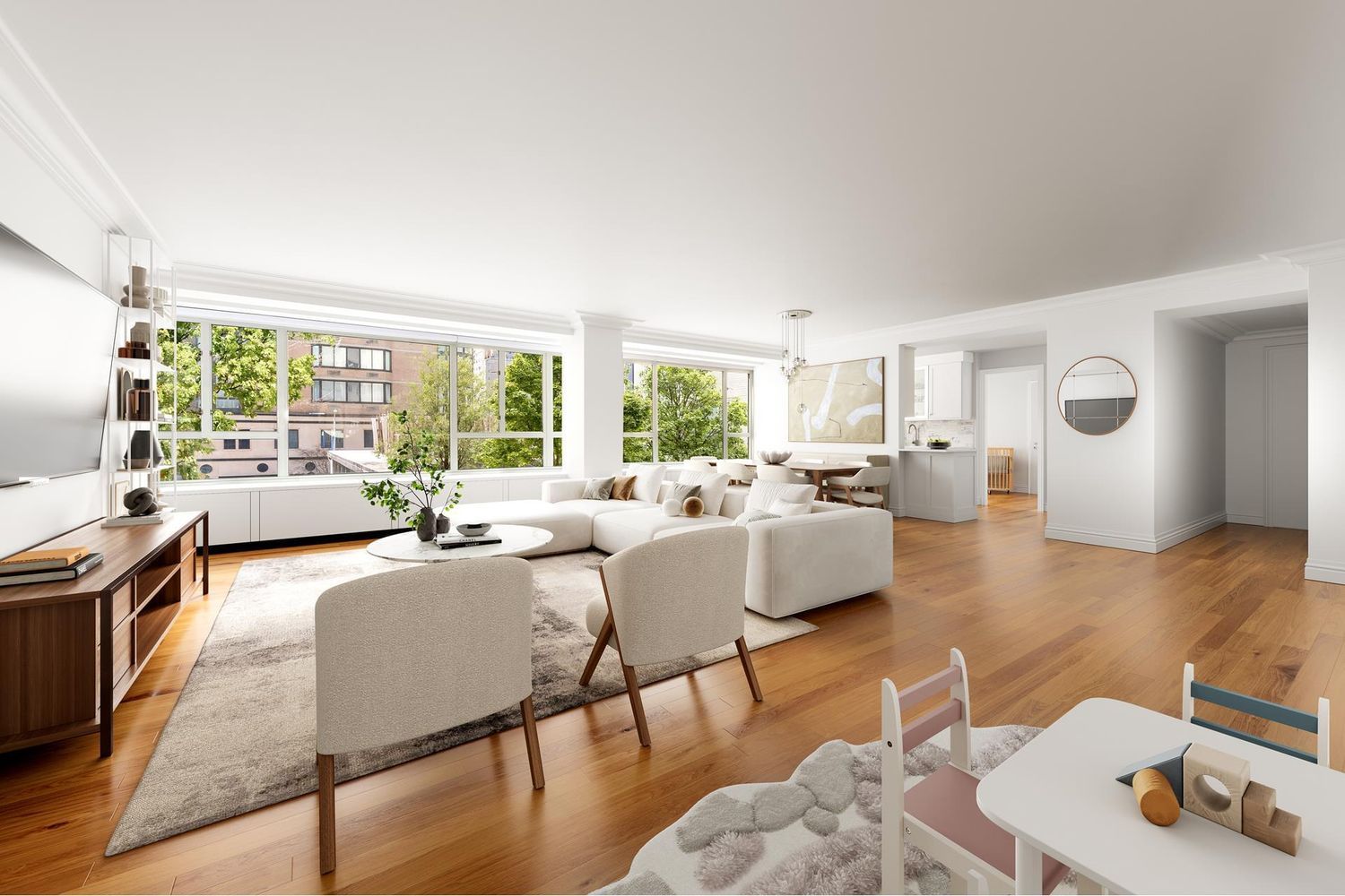Welcome to A301 a unique three-bedroom, three-bathroom home located in the highly sought-after A Tower at the iconic, landmarked Manhattan House. Spanning 1,644 square feet, this beautiful, floor-thru home boasts south and north exposures, bathing the interiors in natural light while offering setback private garden views and pin-drop quiet surroundings-a true sanctuary from the city's hustle.
