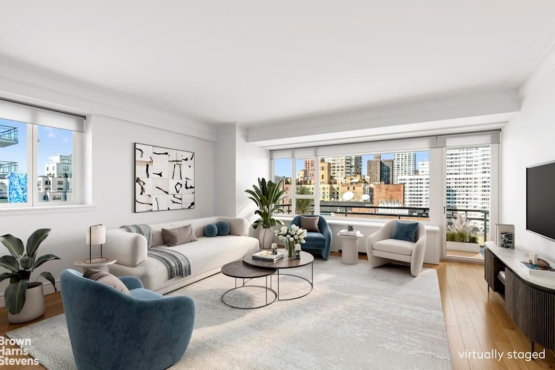 Here is an exceptional high-floor, split two-bedroom, two-bathroom apartment with private outdoor space in the beloved Manhattan House. The large windows frame open northern views uptown and bring great light into the apartment.