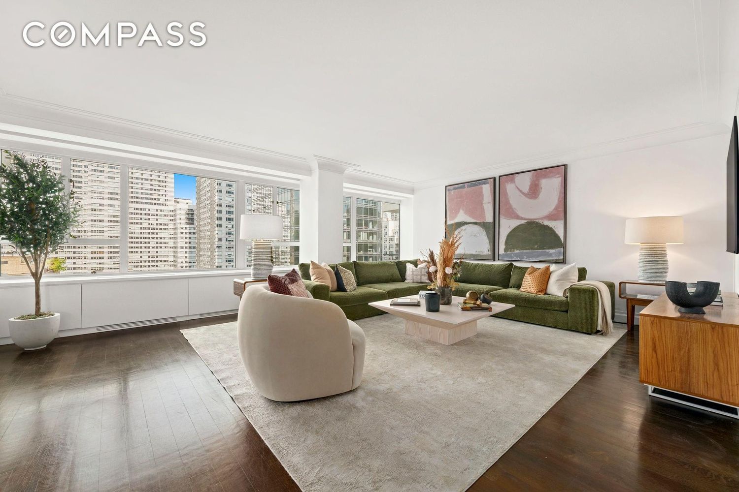 The great room has a 33' expanse of Living room through to the Dining room with beautiful hardwood floors throughout the entire home. Large wall of windows provide glorious sunlight all day. There are two, that's right, two 11'x7' terraces, one off the great room and another off the primary suite. All rooms have remote control double blinds