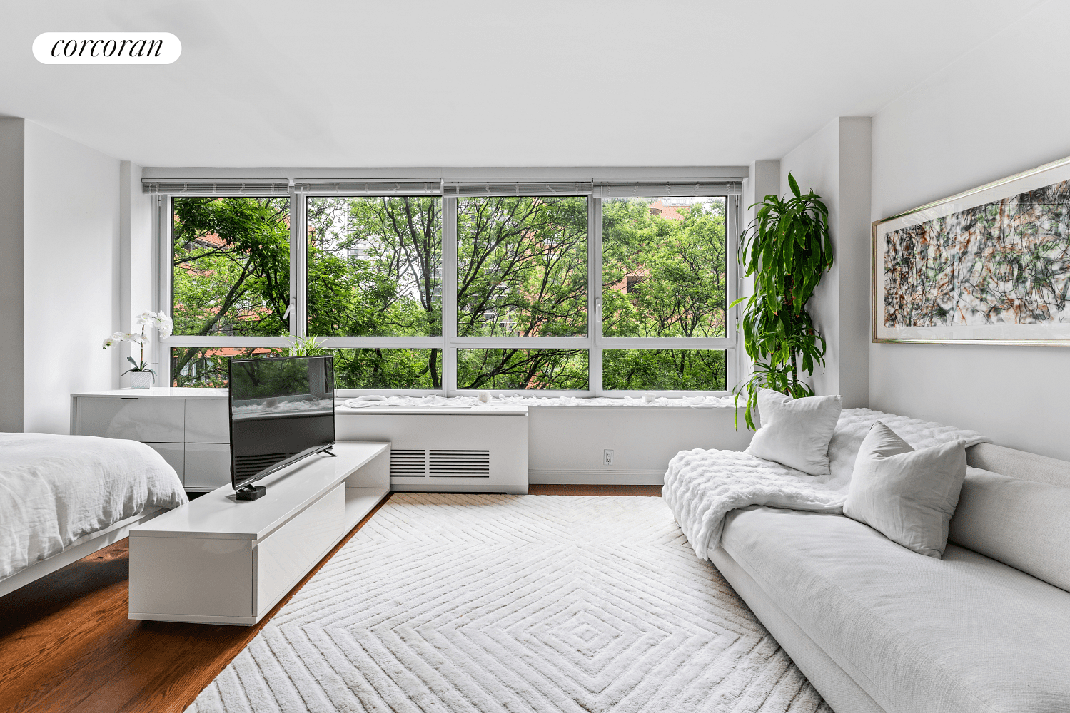 Bathed in morning light, this thoughtfully designed home features oversized windows that frame picturesque views of the building's lush, tree-filled private courtyard-an exclusive half-acre park that serves as a rare urban sanctuary. The quiet exposure ensures a peaceful ambiance throughout the day.