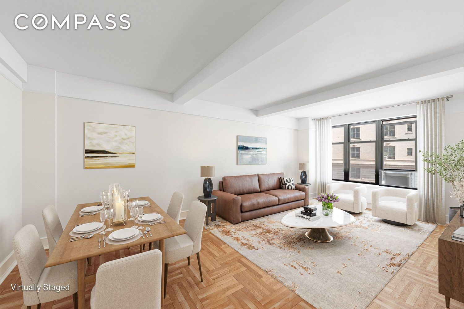 The entrance hall, featuring three closets, leads to a versatile foyer that can double as a dining area. The spacious, sunken living room offers northern views toward the Belnord, where Only Murders in the Building is filmed. This room easily accommodates both dining and living areas, perfect for entertaining.