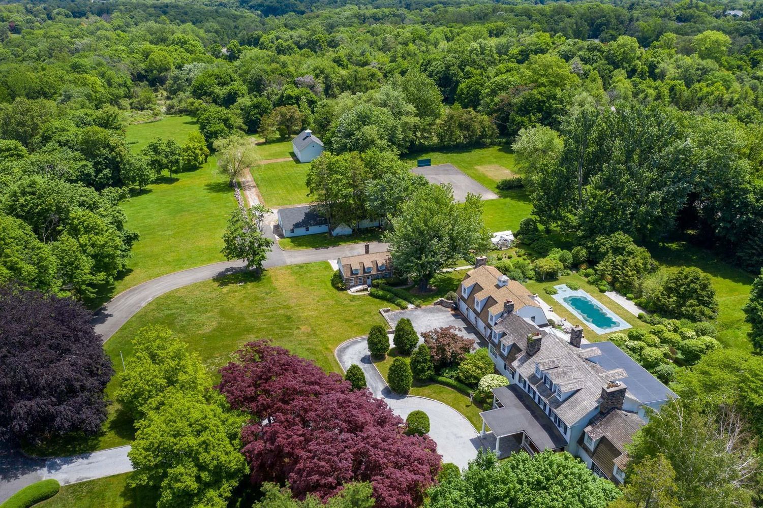 A one of a kind estate compound on 17.73 acres, incredibly offered for under 10 million dollars, and one of the largest and most exclusive properties offered in Purchase in many years. Estate includes: (i) a totally renovated and elegant 6 bedroom primary home; (ii) adorable 3 bedroom stone guest cottage; (iii) oversized pool with adjoining cabana/great room/BBQ/kitchen facilities; (iv) an enormous multi purpose separate outbuilding with horse stalls and extra garage bays; (v) stand alone horse barn; (vi) greenhouse; (vii) separate paved/possible sport court space; and (viii) multi acre level park-like extra land. This special and unique offering in lower Westchester is perfect as a convenient get away compound, horse property and/or just a spectacular year round estate with priceless extra property. Unmatched convenience to NYC, airports, water/boating, golf/country clubs, and numerous vibrant downtown areas including Rye, White Plains and Greenwich. Rolling lawns, magnificent plantings, fountains/reflecting pond, inviting front porch, private gated approach and so many special extras too numerous to list. A treasure property to be had for generations, so rarely offered in lower Westchester and incredibly priced.