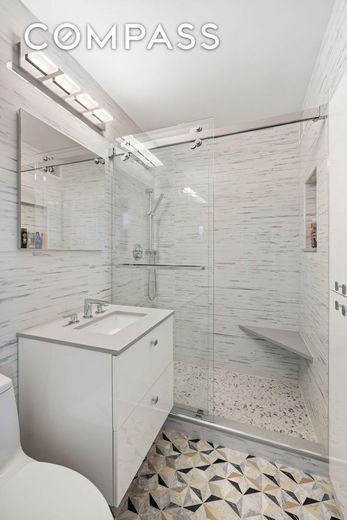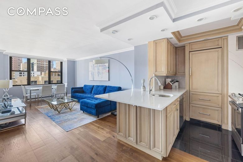 Apartment 15D is a beautifully renovated home with sweeping west and north facing views. The open kitchen features premium appliances, and an expansive breakfast bar with quartz counters, perfect for casual meals and a great space to concoct endless culinary creations. There is great storage including a pull-out pantry and custom wine rack. The bathroom is stunning and offers gorgeous tile flooring, a glass enclosed walk-in shower, a built-in shower niche for your toiletries, and a tasteful vanity for your additional storage needs. A few other notable features of this impeccable move-in ready home are the wide-plank hardwood floors, crown molding, copious closets, recessed lighting, a new ac/heating unit in the living room and more. All of this and the cherry on top is the low maintenance!