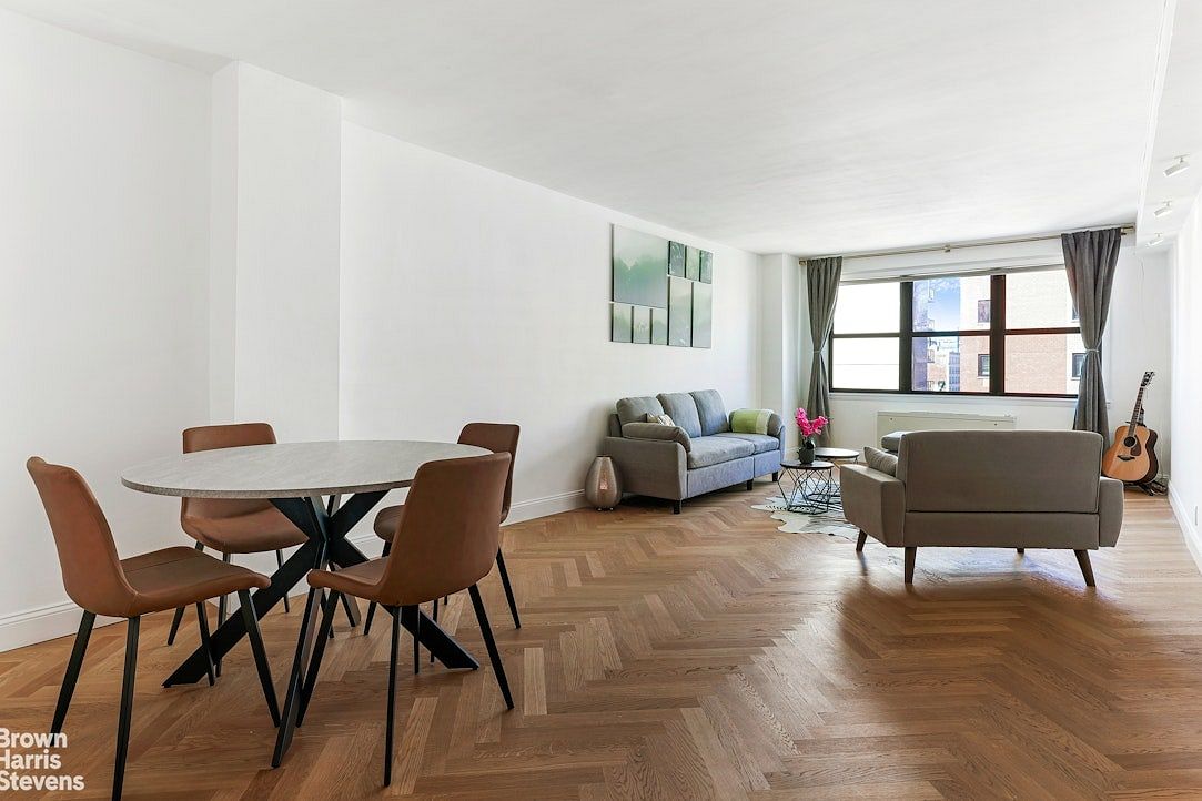 The home opens into a bright and expansive living and dining area, accented by classic herringbone hardwood floors and oversized windows that frame the sweeping New York skyline. Just off the entry, a large walk-in closet provides exceptional storage. The renovated kitchen combines style and practicality with sleek cabinetry, stainless steel appliances, and generous counter space.
