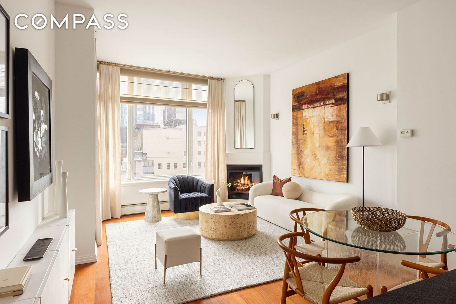Inside this luxurious two-bedroom, two-bathroom 1,113 square foot home, ceilings soar 10 feet high over handsome wide-plank teak floors and oversized windows framing glorious natural light. A gracious entry flanked by a coat closet and well-appointed guest bathroom ushers you into the stunning great room. Here, the open-plan layout provides a generous footprint for relaxing and entertaining alongside the gas-burning fireplace or step onto the adjacent balcony for morning coffee overlooking the sights of Midtown. Chefs will love the open gourmet kitchen where maple wood stained cabinetry, dark countertops and a glass tile backsplash surround Viking and Sub-Zero stainless steel appliances, including a gas range, cabinet-front refrigerator, dishwasher and built-in microwave. The wide breakfast bar is the perfect spot for casual dining.