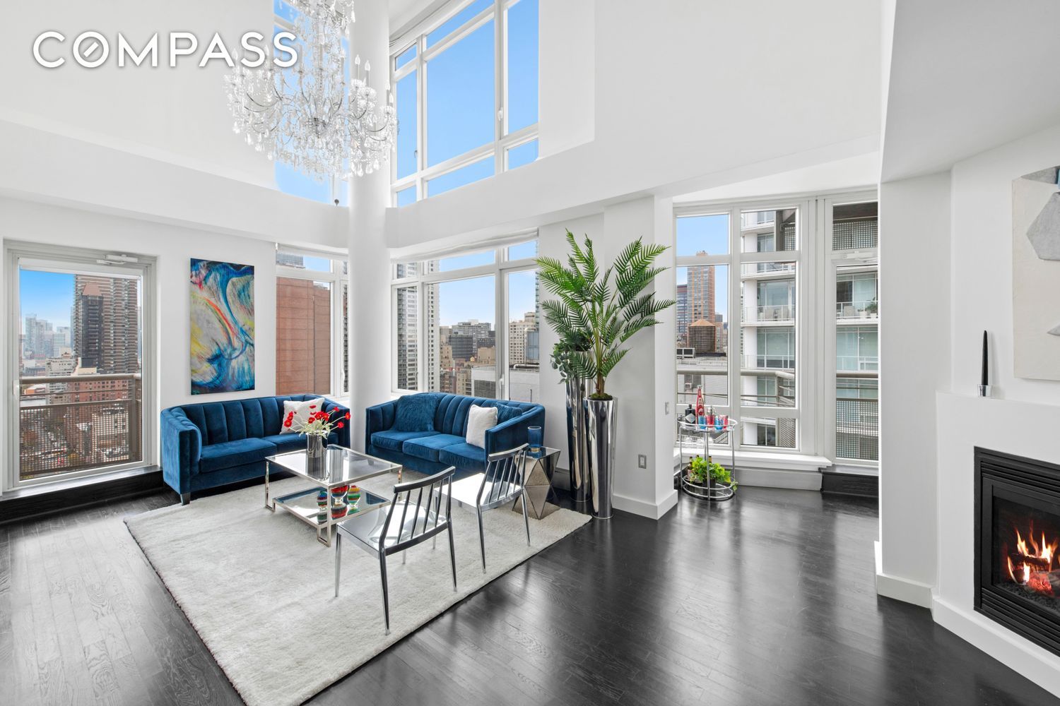 Experience unparalleled luxury at 205 E 59th St, Unit 23A, in the heart of Lenox Hill. The apartment offers an inviting, open-concept living area highlighted by soaring double-height ceilings, enhancing the sense of spaciousness and grandeur. The tall ceilings are truly breathtaking, with 20-foot walls of windows that flood the apartment with natural light. Enjoy cozy evenings by the working gas fireplace or step out onto either of the two private balconies to take in breathtaking views of the city. Dimmable lights give you control of the atmosphere, and the numerous closet space throughout the unit ensure ample storage solutions.
