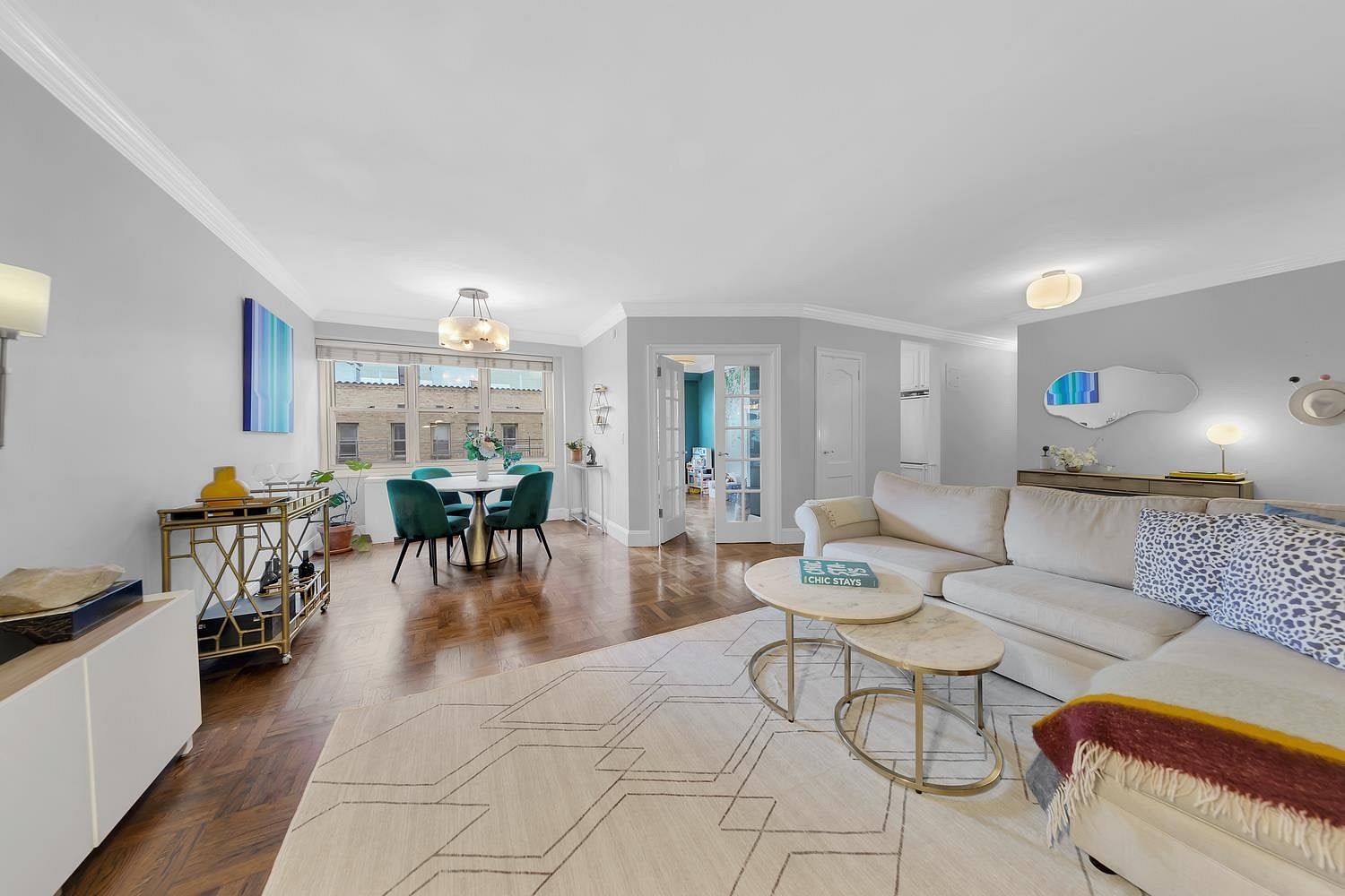 Upon entering, you're welcomed into an expansive living area featuring elegant built-in mirrored shelving and a bright, south-facing dining space. French doors open to a serene third bedroom, which can also serve as a home office, offering delightful city views. The modernized chef's kitchen boasts top-of-the-line stainless steel appliances from Miele, KitchenAid, and LG, along with Caesarstone countertops and ample custom cabinetry-making it a dream for anyone who loves to cook.