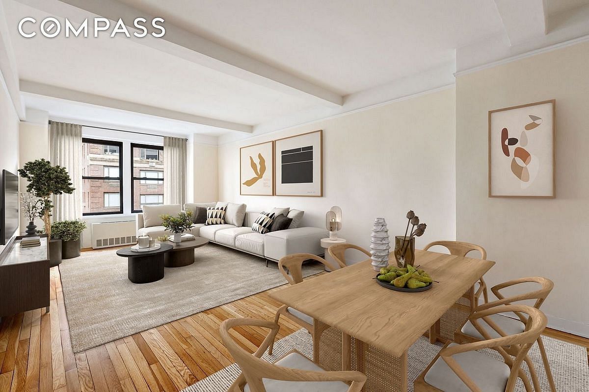 Open western city views highlight this bright corner one-bedroom featuring an oversized living room with space for a dining area or a home office in a full-service Upper East Side pre-war cooperative.
