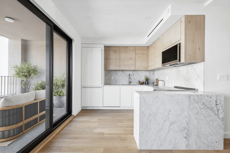 The heart of the home is the living and dining room, which transitions effortlessly to the private 234 sqft balcony. This outdoor haven is perfect for savoring morning coffee, hosting evening gatherings, or simply unwinding. The stylish open-concept kitchen features custom two-tone cabinetry, luxurious Calacatta marble countertops, a striking marble backsplash, and a high-end Bertazzoni appliance package.
